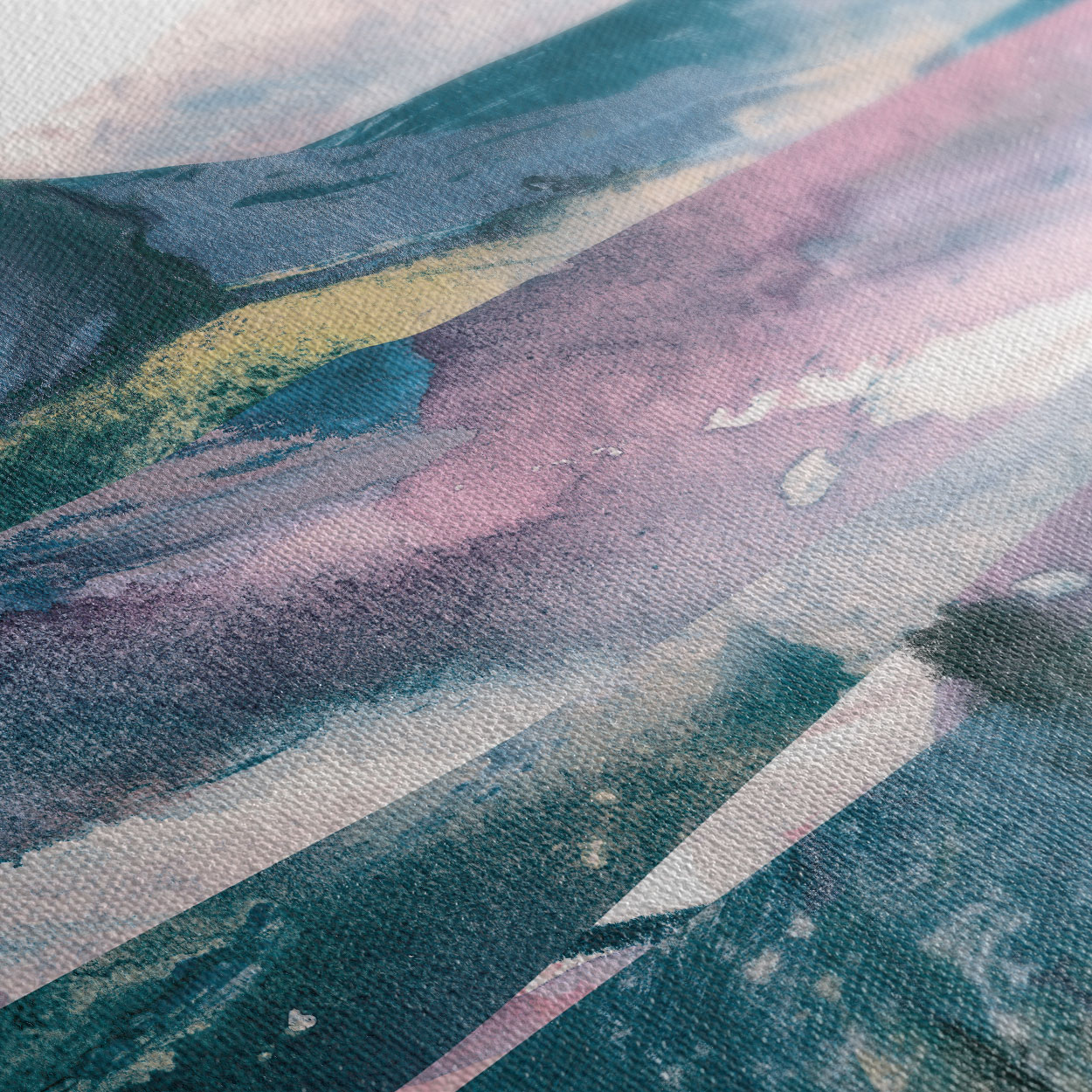 Μια πολυεπίπεδη και καλλιτεχνική σύνθεση που αναπαριστά ορεινούς όγκους μέσα από αφηρημένες φόρμες και μια εντυπωσιακή παλέτα χρωμάτων. Το βαθύ πράσινο του δάσους στο κάτω μέρος συναντά τις μωβ, ροζ και γαλαζοπράσινες στρώσεις των βουνών, δημιουργώντας ένα αποτέλεσμα που θυμίζει σύγχρονη κολάζ-τοιχογραφία.