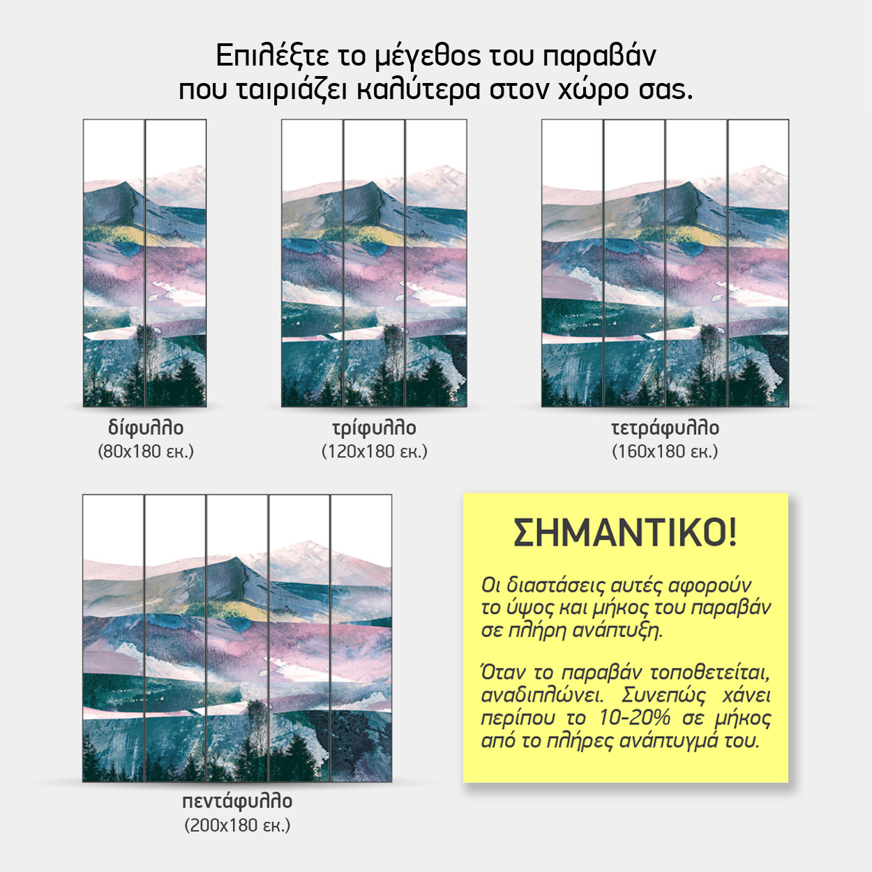 Σημαντική Σημείωση: Οι παραπάνω διαστάσεις αφορούν το παραβάν σε πλήρη ανάπτυξη. Κατά την τοποθέτηση, επειδή τα φύλλα αναδιπλώνονται (ζικ-ζακ) για να στέκονται, το ωφέλιμο μήκος μειώνεται κατά περίπου 10-20%.