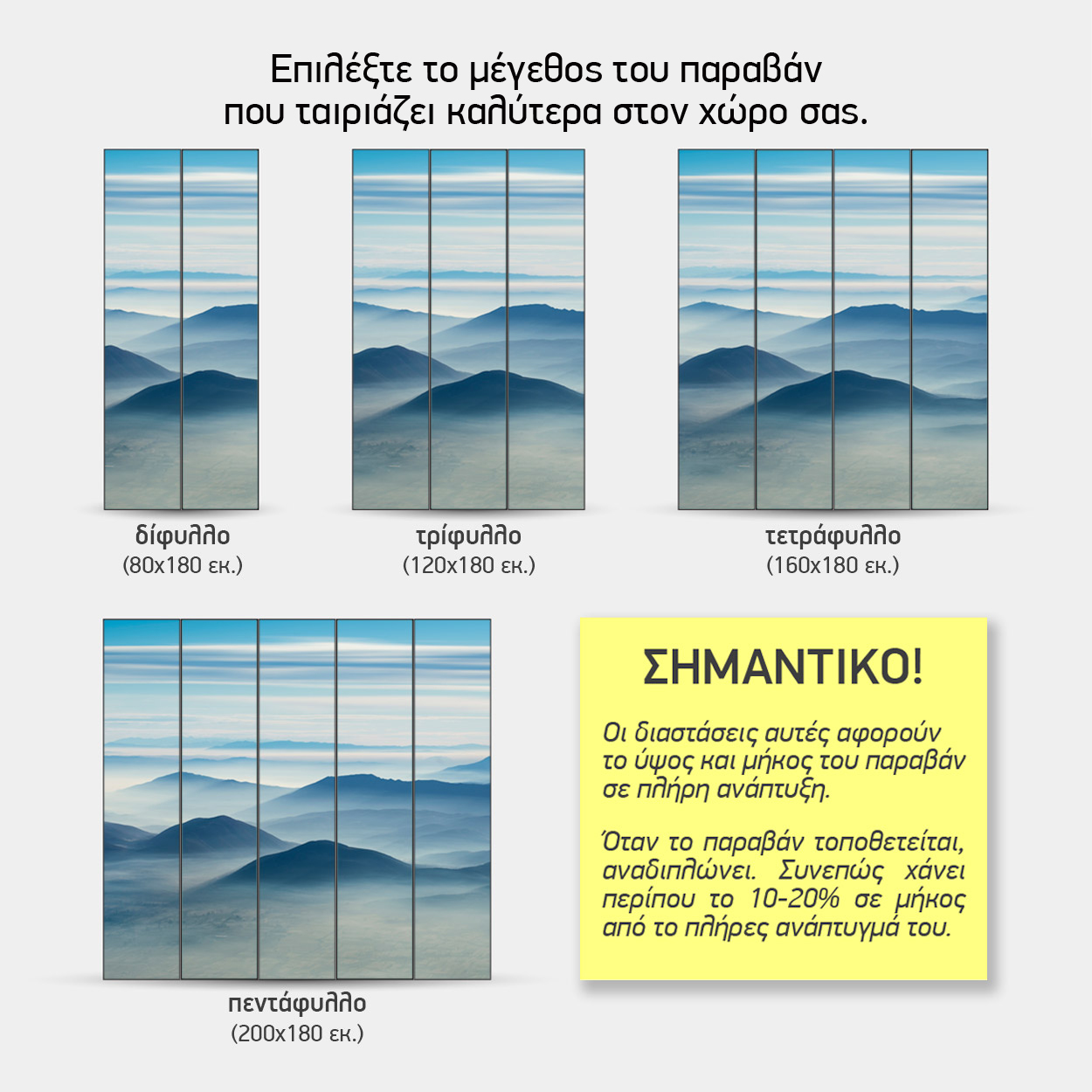 Σημαντική Σημείωση: Οι παραπάνω διαστάσεις αφορούν το παραβάν σε πλήρη ανάπτυξη. Κατά την τοποθέτηση, επειδή τα φύλλα αναδιπλώνονται (ζικ-ζακ) για να στέκονται, το ωφέλιμο μήκος μειώνεται κατά περίπου 10-20%.