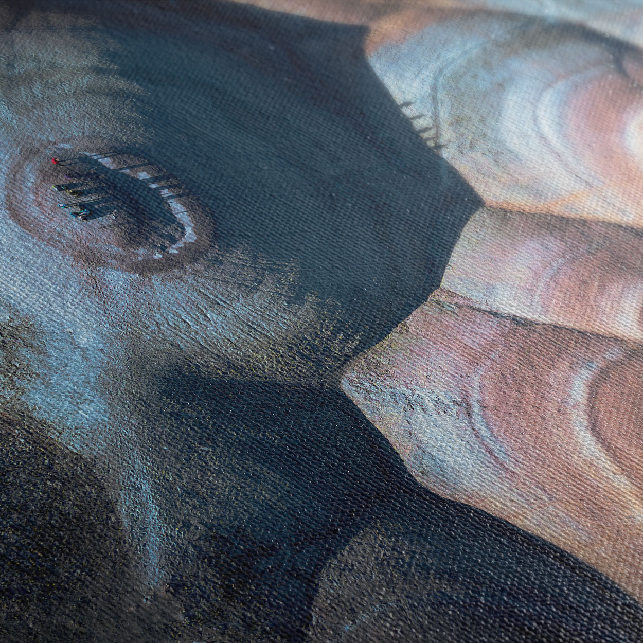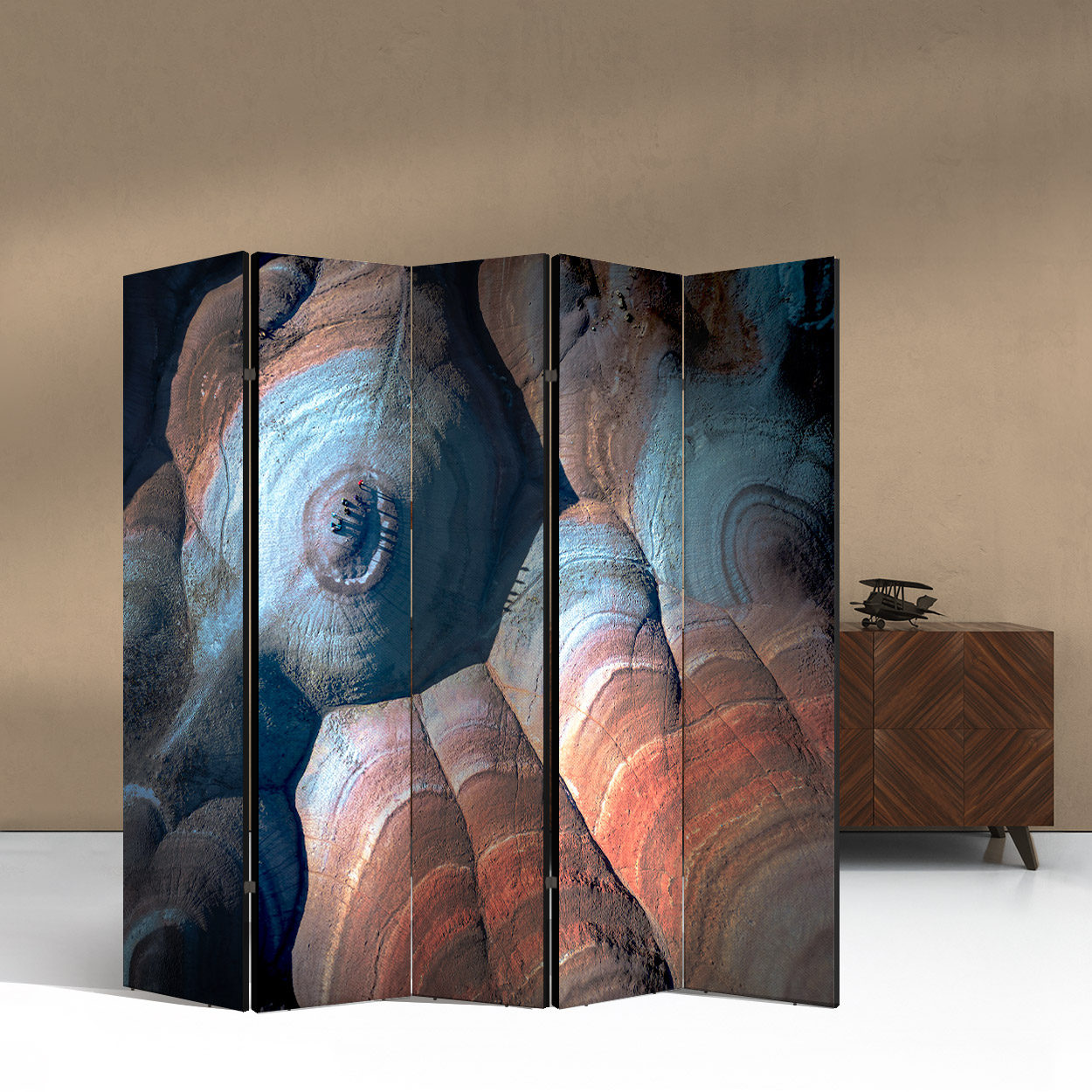 Μια καθηλωτική εναέρια απεικόνιση που μοιάζει με αφηρημένο πίνακα ζωγραφικής, αποκαλύπτοντας τα κρυμμένα χρώματα και τις υφές του πλανήτη μας. Το σχέδιο "Πολύχρωμοι Λόφοι" παρουσιάζει ομόκεντρους γεωλογικούς σχηματισμούς σε αποχρώσεις του τερακότα, του γαλάζιου και του γκρι, δημιουργώντας μια αίσθηση βάθους και φυσικής αρμονίας.