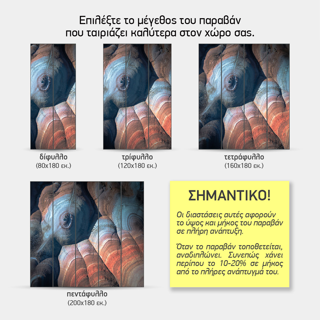 Σημαντική Σημείωση: Οι παραπάνω διαστάσεις αφορούν το παραβάν σε πλήρη ανάπτυξη. Κατά την τοποθέτηση, επειδή τα φύλλα αναδιπλώνονται (ζικ-ζακ) για να στέκονται, το ωφέλιμο μήκος μειώνεται κατά περίπου 10-20%.