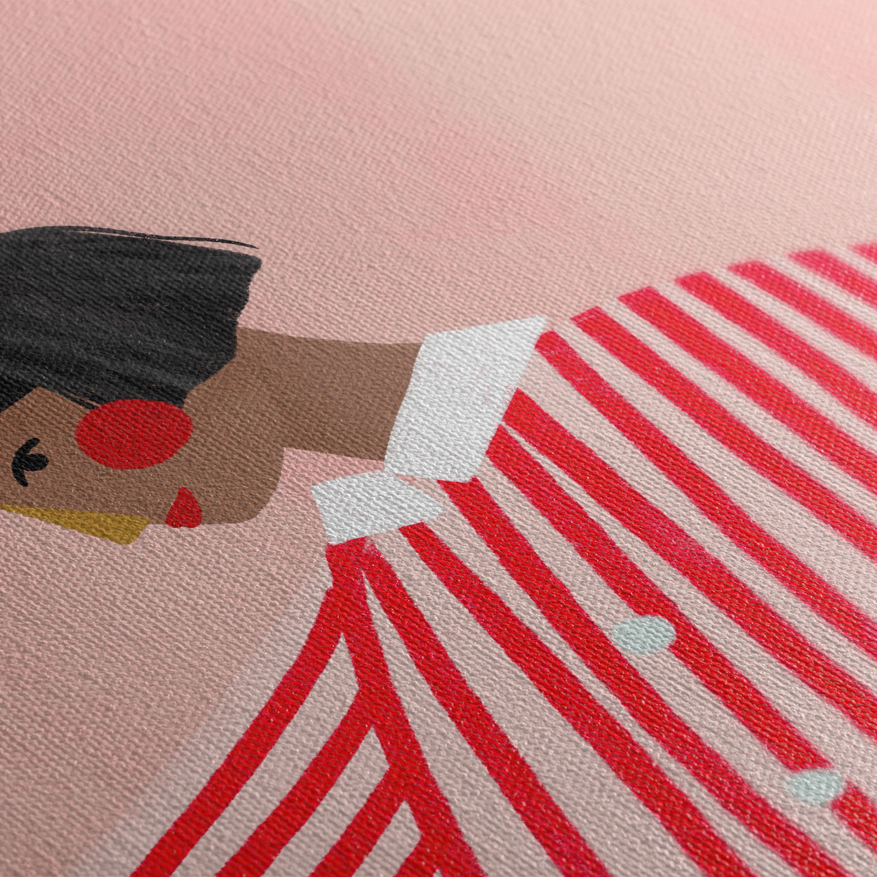 Μια τολμηρή και γεμάτη ζωντάνια σύνθεση που απεικονίζει μια γυναικεία φιγούρα σε ένα έντονο ροζ φόντο, φορώντας ένα ρούχο με ρυθμικές κόκκινες ρίγες. Το σχέδιο ακολουθεί την αισθητική του σύγχρονου illustration, παίζοντας με τις αντιθέσεις των χρωμάτων και την απλότητα των σχημάτων.