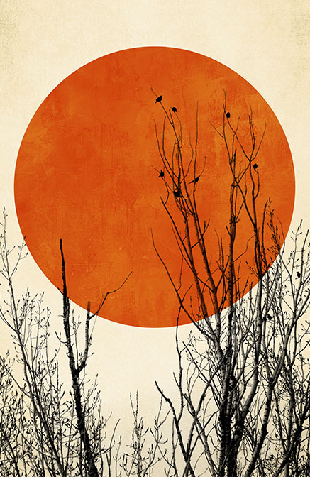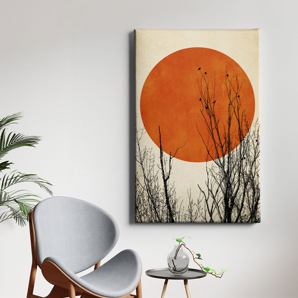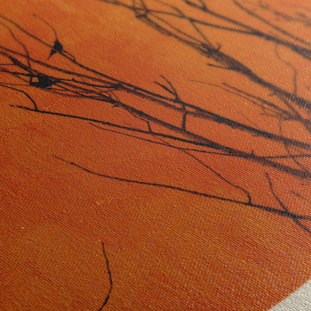 Πίνακας ζωγραφικής με μια ποιητική και ατμοσφαιρική σύνθεση που αποτυπώνει τη γαλήνη της φύσης μέσα από μια σύγχρονη, μινιμαλιστική ματιά. Η έντονη αντίθεση ανάμεσα στο θερμό πορτοκαλί του ήλιου και το βαθύ μαύρο των κλαδιών δημιουργεί ένα ζεστό και ισορροπημένο οπτικό αποτέλεσμα σε υπόλευκο φόντο. Ιδανική επιλογή για Modern Minimal, Scandi ή Zen διακόσμηση. Ένας πίνακας που προσδίδει ηρεμία και καλλιτεχνικό βάθος σε σαλόνια, υπνοδωμάτια ή χώρους μελέτης.