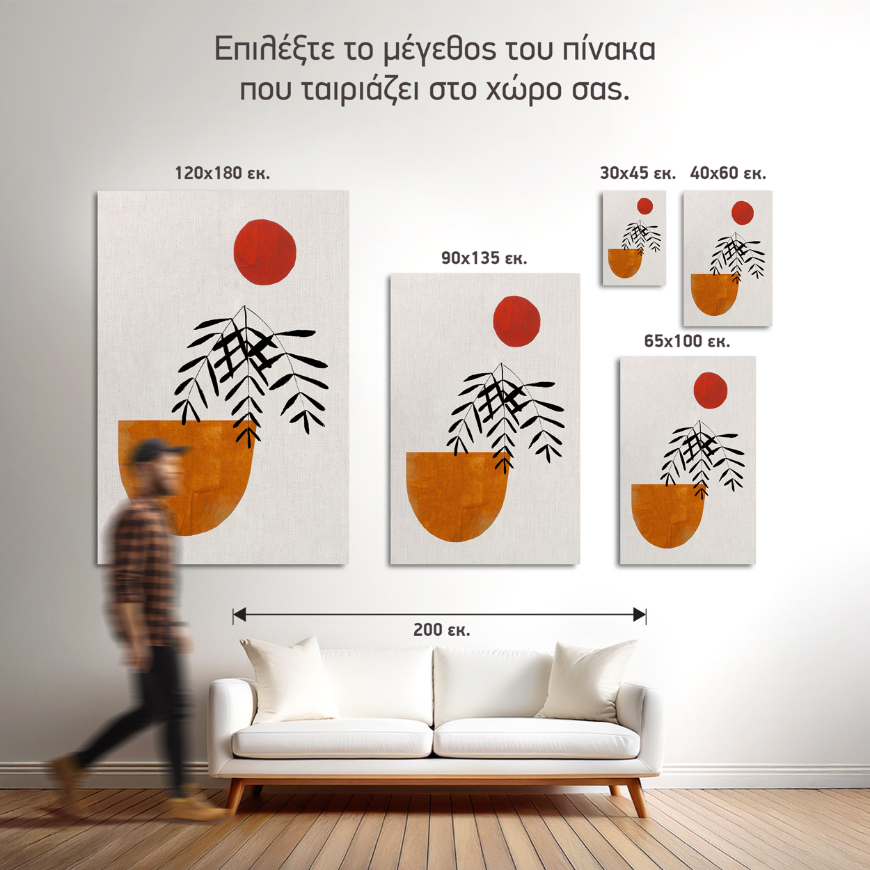 Πίνακας ζωγραφικής που ισορροπεί ανάμεσα στον αφηρημένο μινιμαλισμό και τη γήινη αισθητική, προσφέροντας έναν ζεστό και σύγχρονο τόνο στον τοίχο σας. Μια αφαιρετική απεικόνιση ενός φυτού κάτω από έναν λαμπερό κόκκινο ήλιο, που συνδυάζει απλά γεωμετρικά σχήματα με οργανικές γραμμές. Η απόλυτη επιλογή για Modern Boho ή Mid-century διακόσμηση. Ταιριάζει εξαιρετικά σε σαλόνια, γραφεία ή χώρους που αναζητούν ένα μοντέρνο «statement» κομμάτι με φυσικές αναφορές.