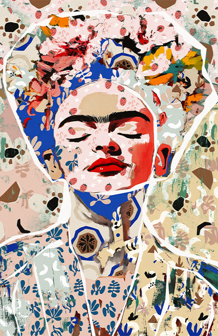 Πίνακας Ζωγραφικής με ένα ζωντανό και πολυεπίπεδο έργο που επαναπροσδιορίζει το εμβληματικό στυλ της Frida Kahlo μέσα από μια σύγχρονη, maximalist αισθητική γεμάτη χρώμα και συμβολισμούς. Μια εντυπωσιακή πορσωπογραφία που παραπέμπει στη θρυλική Μεξικανή ζωγράφο, με τα μάτια κλειστά σε μια στιγμή εσωτερικής γαλήνης, πλαισιωμένη από ένα πλούσιο "στεφάνι" λουλουδιών και αφηρημένων σχεδίων. Η ιδανική επιλογή για Maximalist, Boho ή Eclectic διακόσμηση. Ένας πίνακας που αποπνέει δύναμη και δημιουργικότητα, ικανός να μεταμορφώσει έναν τοίχο σε μια προσωπική γκαλερί τέχνης.