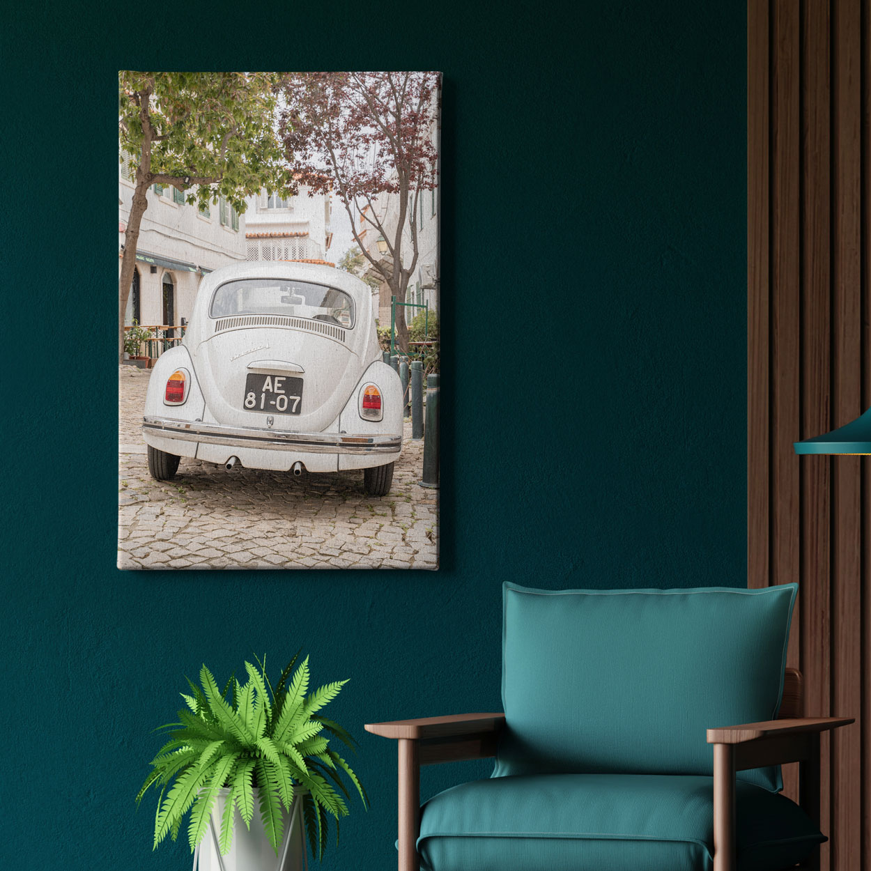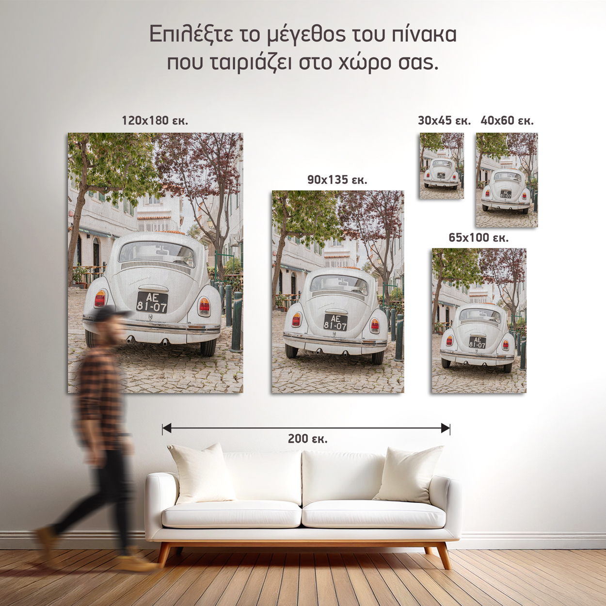 Πίνακας ζωγραφικής με μια ατμοσφαιρική και νοσταλγική λήψη που αποτυπώνει τη γοητεία του παλιού και την ομορφιά των καλοκαιρινών περιπλανήσεων σε γραφικά ευρωπαϊκά σοκάκια. Ένας κλασικός λευκός «Σκαραβαίος» (Volkswagen Beetle) σταθμευμένος σε ένα λιθόστρωτο δρόμο, πλαισιωμένος από παραδοσιακή αρχιτεκτονική και τη φύση. Ιδανική επιλογή για Vintage, Rustic ή Mediterranean στυλ διακόσμησης. Ταιριάζει υπέροχα σε σαλόνια, γραφεία ή επαγγελματικούς χώρους (όπως café και ξενοδοχεία) που θέλουν να αποπνέουν έναν αέρα διαχρονικής κομψότητας και ταξιδιωτικής διάθεσης.