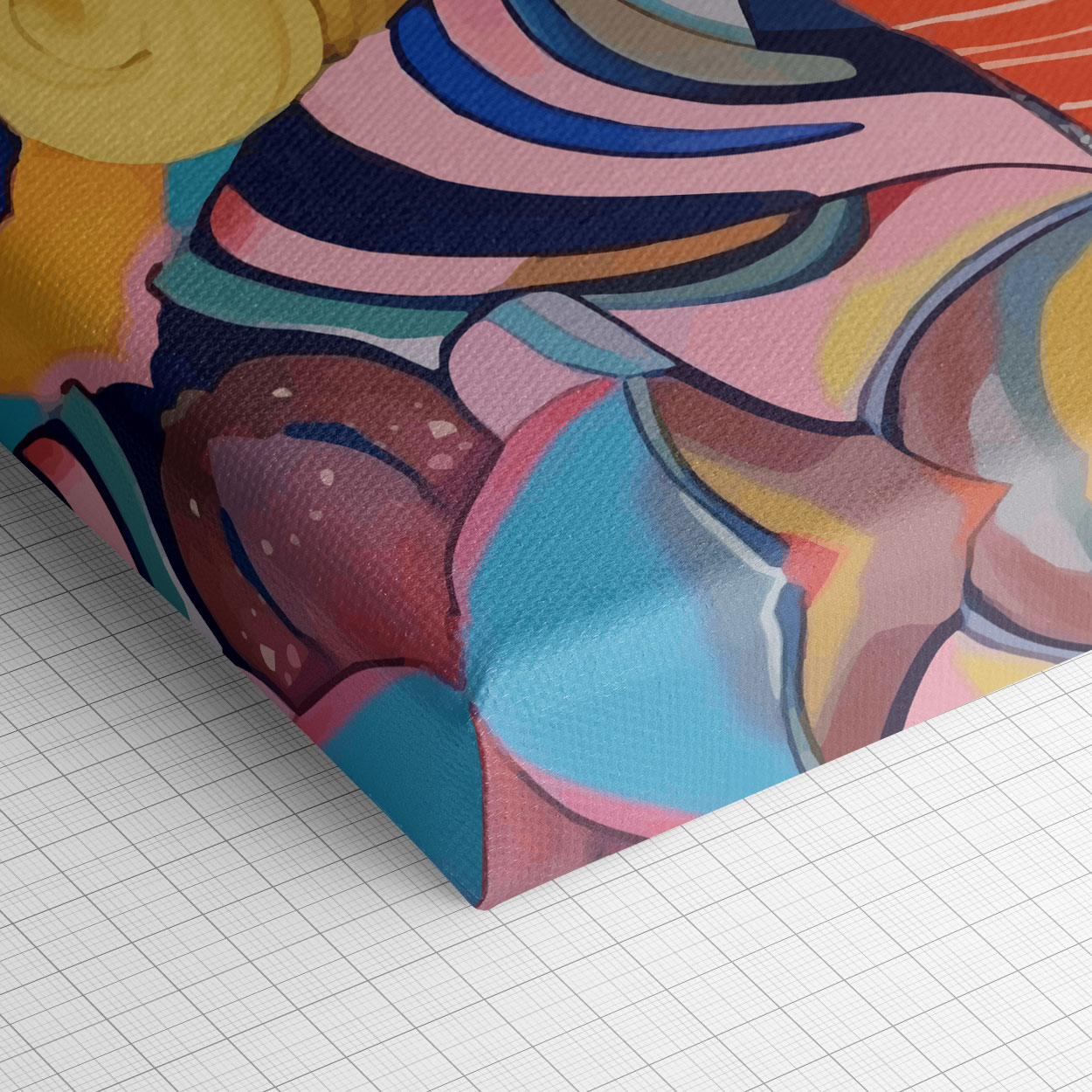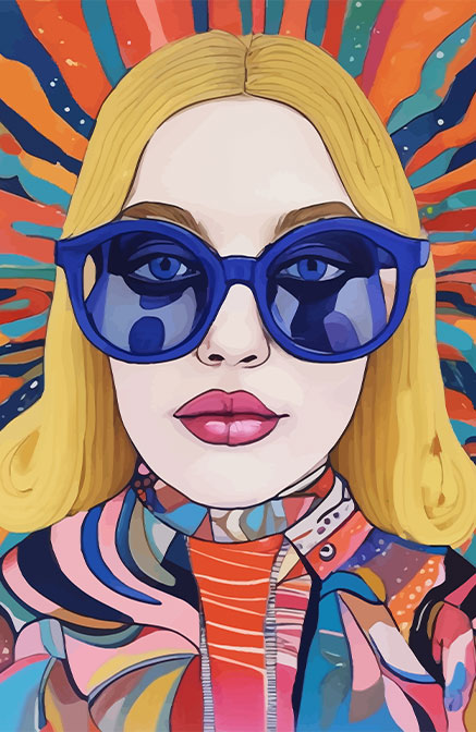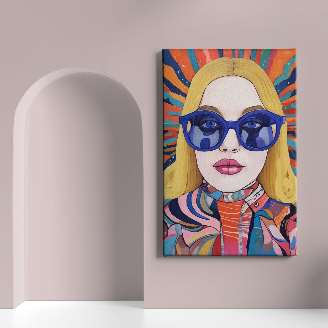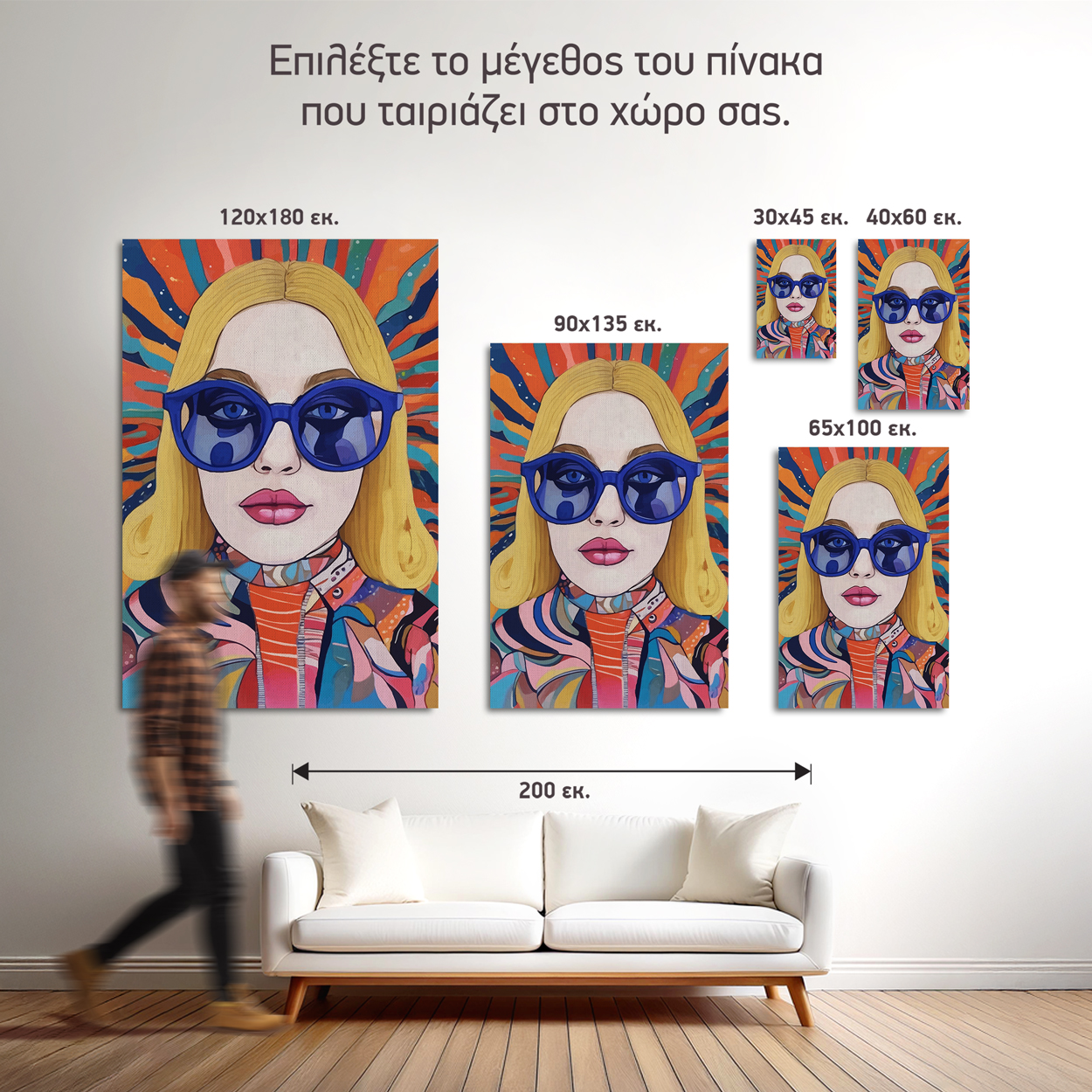 Πίνακας ζωγραφικής με μια εκρηκτική και γεμάτη ενέργεια καλλιτεχνική δημιουργία που φέρνει τη ζωντάνια της Pop Art και τη δυναμική της ψυχεδελικής αισθητικής στον χώρο σας. Το στυλιζαρισμένο πορτρέτο μιας γυναίκας με εντυπωσιακά, μεγάλα μπλε γυαλιά ηλίου, πλαισιωμένο από ένα φόντο με πολύχρωμες, κυματιστές γραμμές που θυμίζουν "έκρηξη" χρωμάτων. Ιδανική επιλογή για μοντέρνα σαλόνια, δημιουργικά studio ή νεανικά δωμάτια. Αποτελεί ένα "bold statement" κομμάτι που αποπνέει αυτοπεποίθηση, δημιουργικότητα και μια σύγχρονη retro-cool διάθεση.