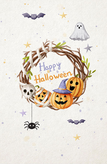 Διακοσμητικός πίνακας ζωγραφικής με θέμα Halloween: watercolor στεφάνι στο κέντρο, διακοσμημένο με κολοκύθες, φαντάσματα, νυχτερίδες και παιχνιδιάρικα στοιχεία. Ιδανικός για οικογενειακούς χώρους, παιδικά δωμάτια, νηπιαγωγεία και βιτρίνες που επιθυμούν μια ήπια, γλυκιά εορταστική ατμόσφαιρα.