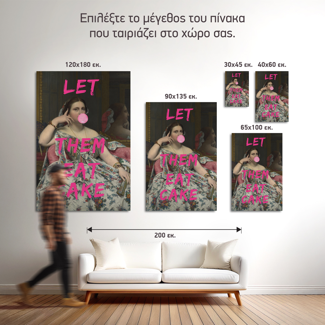 Πίνακας Ζωγραφικής Let Them Eat Cake - Decotek 222331 Πίνακας Ζωγραφικής με μια παιχνιδιάρικη και τολμηρή επανεκτέλεση της κλασικής τέχνης, που συνδυάζει την ιστορική πολυτέλεια με τη σύγχρονη pop κουλτούρα. Μια επιβλητική πορσωπογραφία μιας αριστοκράτισσας σε ένα κλασικό σκηνικό, η οποία «σπάει» τη σοβαρότητα του έργου φυσώντας μια ροζ φούσκα από τσίχλα, κάτω από το εμβληματικό σύνθημα "Let Them Eat Cake".Ένα κομμάτι που αποπνέει ειρωνεία, στυλ και επαναστατική διάθεση. Ιδανικό για Eclectic διακόσμηση, μοντέρνα σαλόνια ή χώρους που θέλουν να προκαλούν συζητήσεις και χαμόγελα. Ο όρος "σκοτία" στις κορνίζες προέρχεται από την αρχαία ελληνική λέξη "σκοτία" που σημαίνει σκοτάδι. Αυτή η λέξη χρησιμοποιείται για να περιγράψει το σκοτεινό μέρος της κορνίζας, όπου το ξύλο σκιάζει το περιθώριο του καμβά. Σκοπός της σκοτίας είναι να δημιουργήσει μια οπτική αίσθηση εστίασης στο έργο τέχνης, καθιστώτας το πιο επικεντρωμένο στο μάτι του θεατή. Για οποιαδήποτε διάσταση πέραν των τυποποιημένων διαστάσεων ή για κάποιο σχέδιο της επιλογής σας επικοινωνήστε μαζί μας στο 2310 579 990. Ο χρόνος παράδοσης είναι 4-6 εργάσιμες μέρες.