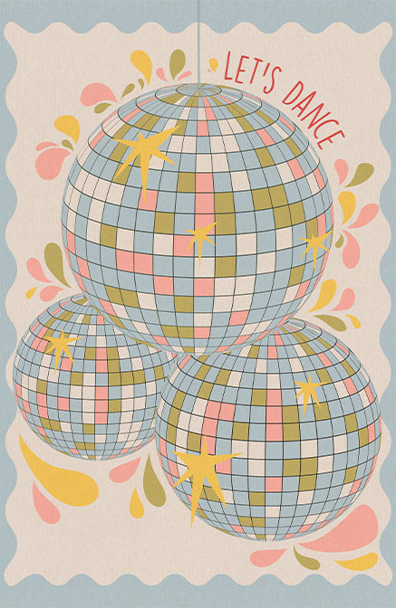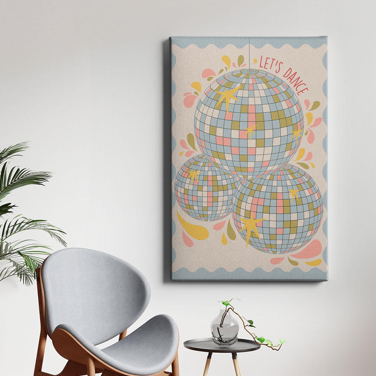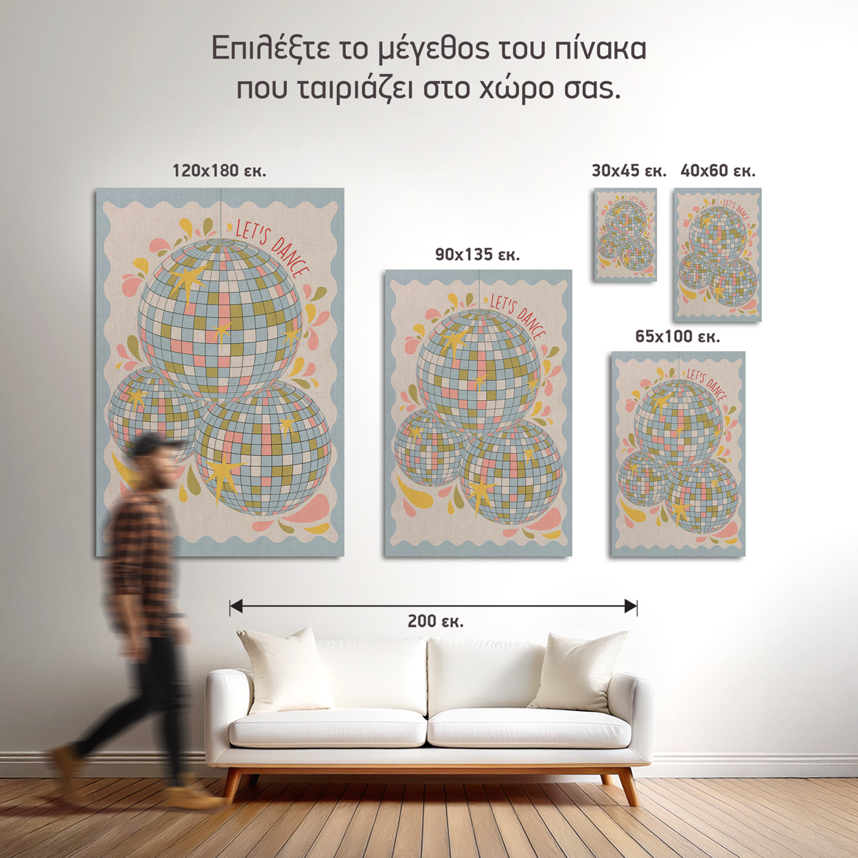 Πίνακας Ζωγραφικής με ένα γεμάτο ενέργεια και νοσταλγία έργο που μεταφέρει τη λάμψη και τη χαρά της disco εποχής στον χώρο σας, ιδανικό για να προσθέσετε μια παιχνιδιάρικη και εορταστική διάθεση. Τρεις λαμπερές ντισκομπάλες που πλαισιώνονται από πολύχρωμα ρετρό σχήματα και τη χειρόγραφη προτροπή "LET'S DANCE" στο επάνω μέρος. Η απόλυτη επιλογή για σαλόνια, δωμάτια ψυχαγωγίας ή νεανικά υπνοδωμάτια. Ταιριάζει ιδανικά σε διακόσμηση Retro, Eclectic ή Mid-Century Modern, λειτουργώντας ως ένα σημείο που εκπέμπει θετικά vibes.