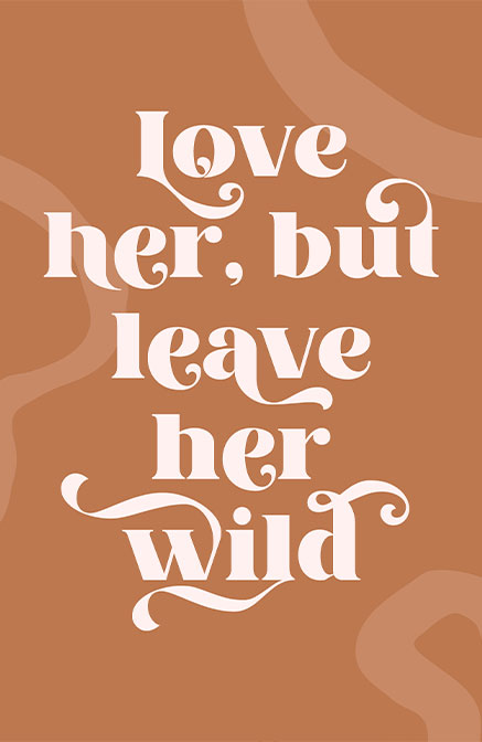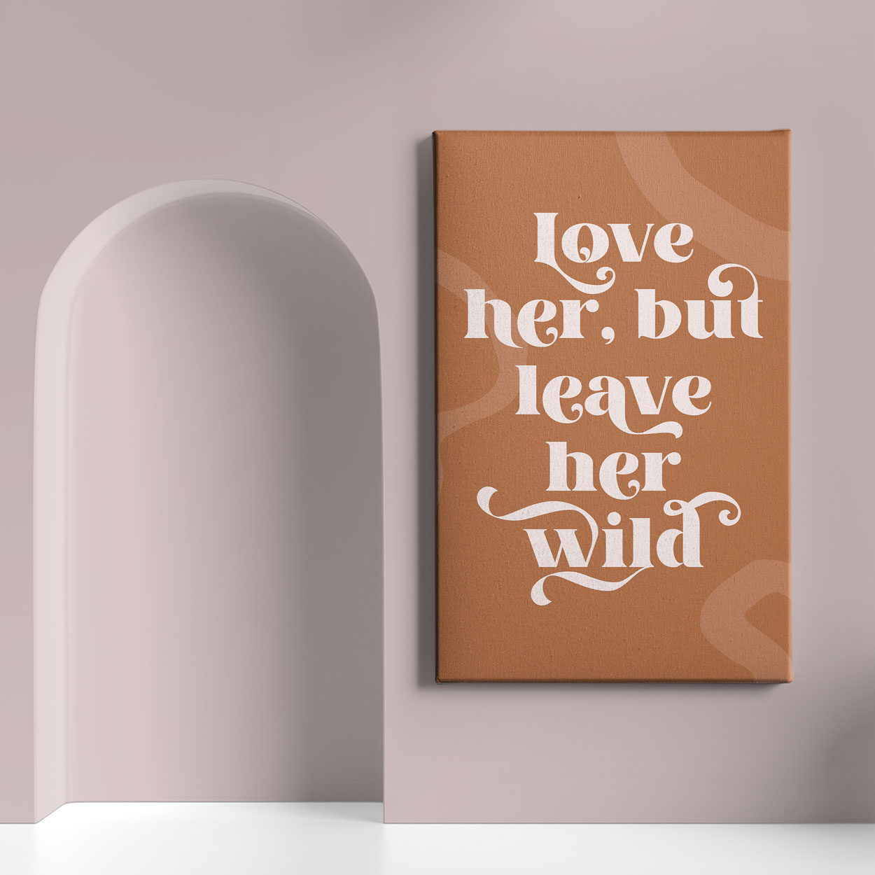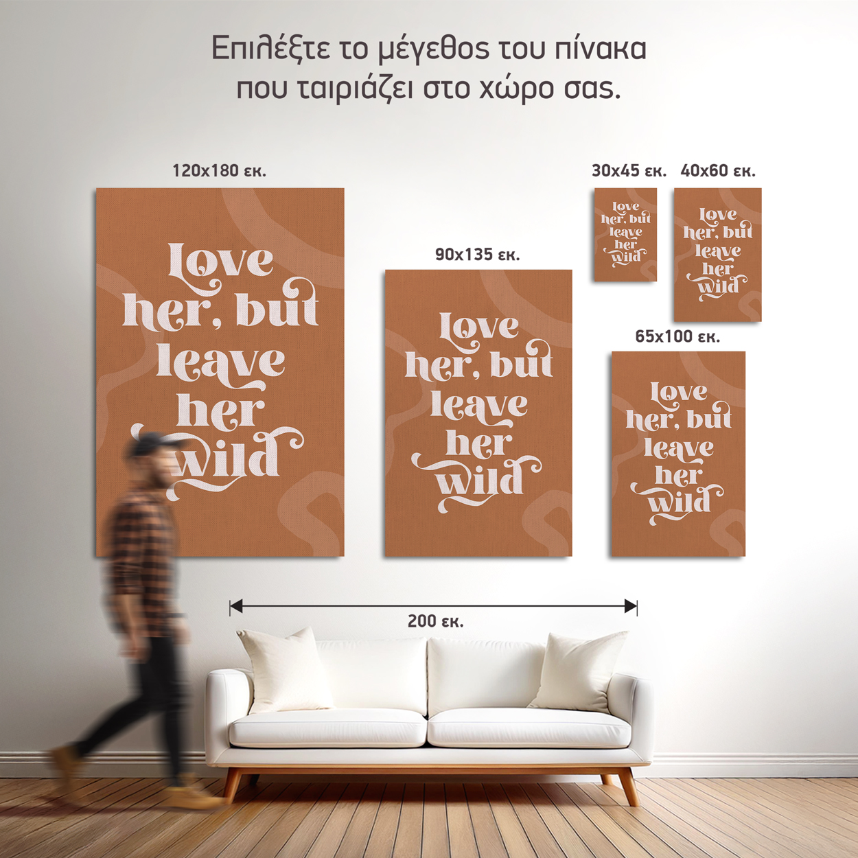 Ένα εμπνευσμένο και δυναμικό έργο τυπογραφίας που υμνεί την ελευθερία και την αυθεντικότητα, προσδίδοντας χαρακτήρα σε κάθε τοίχο. Το εμβληματικό μήνυμα "Love her, but leave her wild" αποτυπωμένο με κομψή, vintage γραμματοσειρά που παραπέμπει στη δεκαετία του '70. Ζεστοί γήινοι τόνοι της τερακότας, του καφέ και του κρεμ, που δημιουργούν μια αίσθηση οικειότητας και "retro-chic" αισθητικής. Η ιδανική επιλογή για Boho, Retro ή Modern Rustic διακόσμηση. Ταιριάζει υπέροχα σε κρεβατοκάμαρες, dressing rooms ή σαλόνια, προσφέροντας καθημερινή έμπνευση με μοναδικό στυλ.