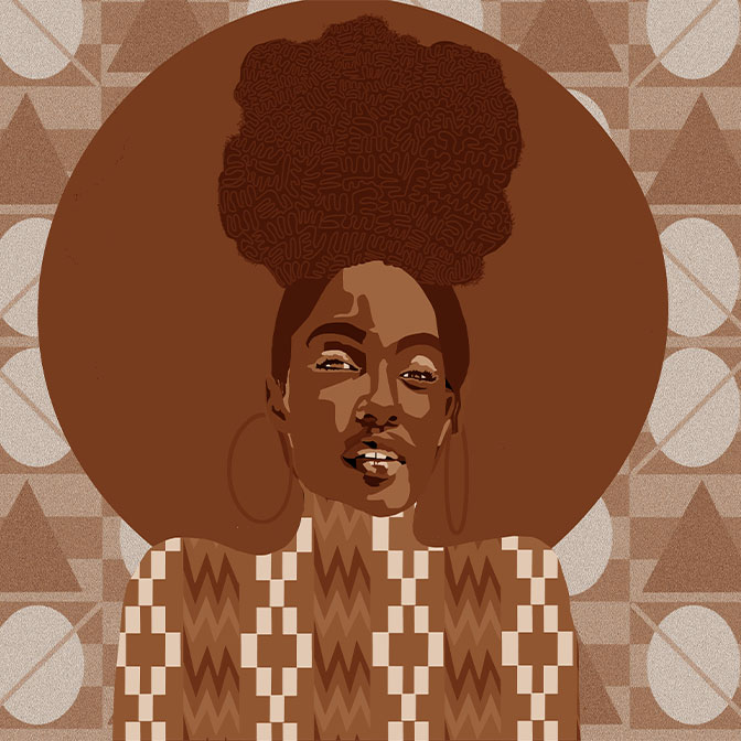 Πίνακας ζωγραφικής με ένα δυναμικό και καλλιτεχνικό πορτρέτο που υμνεί τη γυναικεία ομορφιά και την πολιτιστική ταυτότητα μέσα από ένα σύγχρονο, γεωμετρικό πρίσμα. Μια επιβλητική γυναικεία μορφή με εντυπωσιακό afro hairstyle, η οποία πλαισιώνεται από έναν μεγάλο καφέ κύκλο και ένα πλούσιο γεωμετρικό φόντο. Ιδανική επιλογή για Modern Ethnic, Urban ή Contemporary διακόσμηση. Ένα έργο που αποπνέει αυτοπεποίθηση και δύναμη, τέλειο για να αποτελέσει το κεντρικό σημείο σε ένα σαλόνι ή ένα μοντέρνο υπνοδωμάτιο.