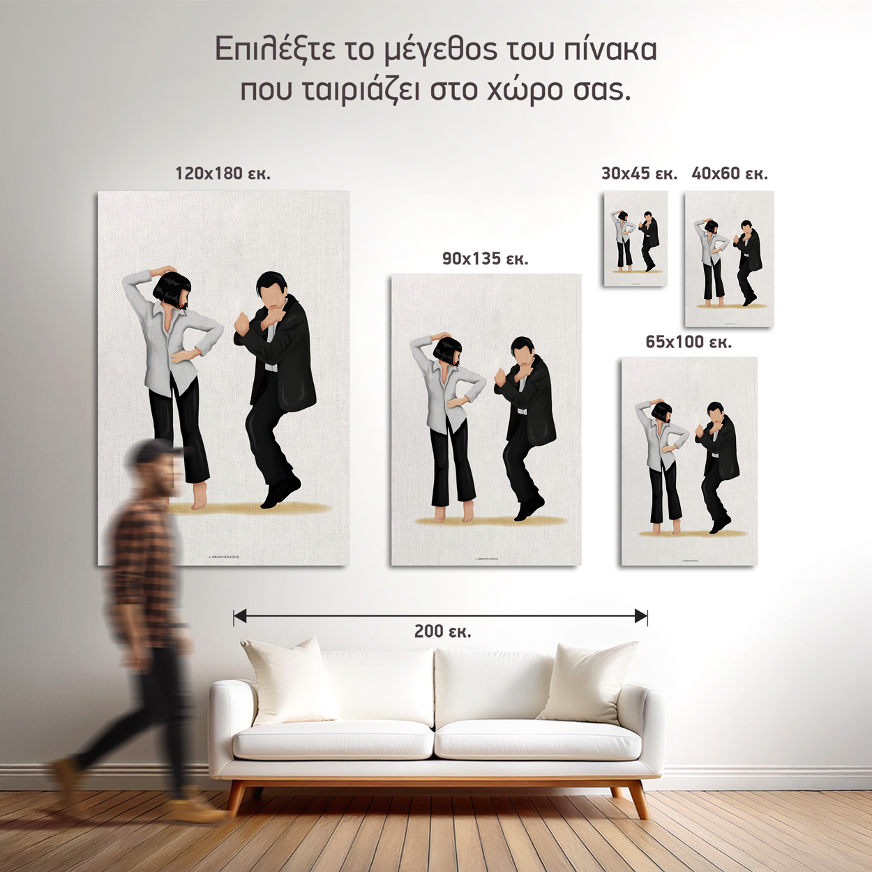 Πίνακας Ζωγραφικής Pulp Fiction Style - Decotek 222326 Πίνακας ζωγραφικής φόρος τιμής σε μια από τις πιο αναγνωρίσιμες σκηνές στην ιστορία του σύγχρονου κινηματογράφου, που αποπνέει στυλ, ρυθμό και "cool" αισθητική. Ο θρυλικός χορός της Mia Wallace και του Vincent Vega από την ταινία "Pulp Fiction", αποτυπωμένος σε μια ιδιαίτερη καλλιτεχνική εκδοχή. Ιδανική επιλογή για home cinema, μοντέρνα σαλόνια, γραφεία ή χώρους ανθρώπων που λατρεύουν την ποπ κουλτούρα και τις ταινίες του Quentin Tarantino. Ο όρος "σκοτία" στις κορνίζες προέρχεται από την αρχαία ελληνική λέξη "σκοτία" που σημαίνει σκοτάδι. Αυτή η λέξη χρησιμοποιείται για να περιγράψει το σκοτεινό μέρος της κορνίζας, όπου το ξύλο σκιάζει το περιθώριο του καμβά. Σκοπός της σκοτίας είναι να δημιουργήσει μια οπτική αίσθηση εστίασης στο έργο τέχνης, καθιστώτας το πιο επικεντρωμένο στο μάτι του θεατή. Για οποιαδήποτε διάσταση πέραν των τυποποιημένων διαστάσεων ή για κάποιο σχέδιο της επιλογής σας επικοινωνήστε μαζί μας στο 2310 579 990. Ο χρόνος παράδοσης είναι 4-6 εργάσιμες μέρες.