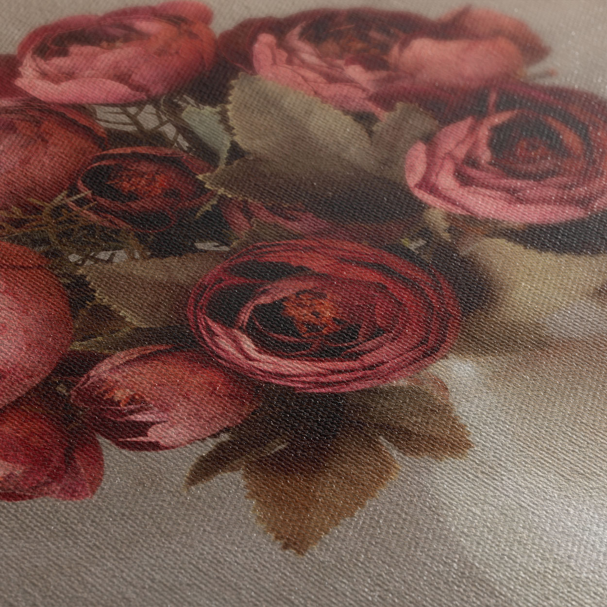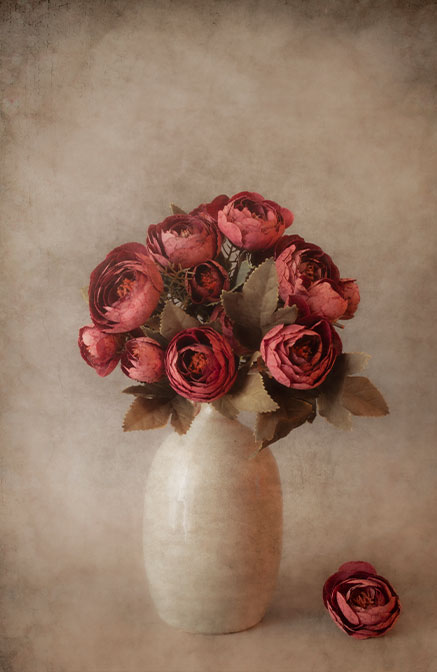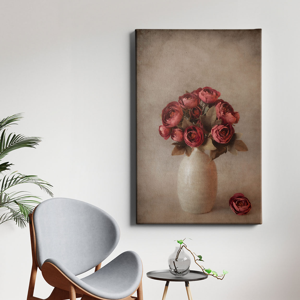 Πίνακας ζωγραφικής που αποπνέει ηρεμία και διαχρονική κομψότητα, ιδανικός για να προσθέσει μια ρομαντική νότα στη διακόσμησή σας. Σύνθεση από πλούσιες παιώνιες σε βαθύ μπορντό χρώμα, τοποθετημένες σε λιτό κεραμικό βάζο. Γήινοι και μπεζ τόνοι στο φόντο που αναδεικνύουν την ένταση των λουλουδιών. Vintage στυλ με απαλή υφή (shabby chic), ιδανικό για την κρεβατοκάμαρα, το σαλόνι ή χώρους με κλασικό design.