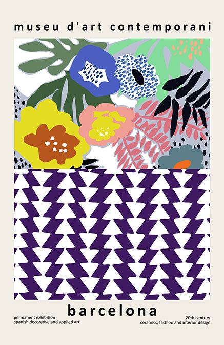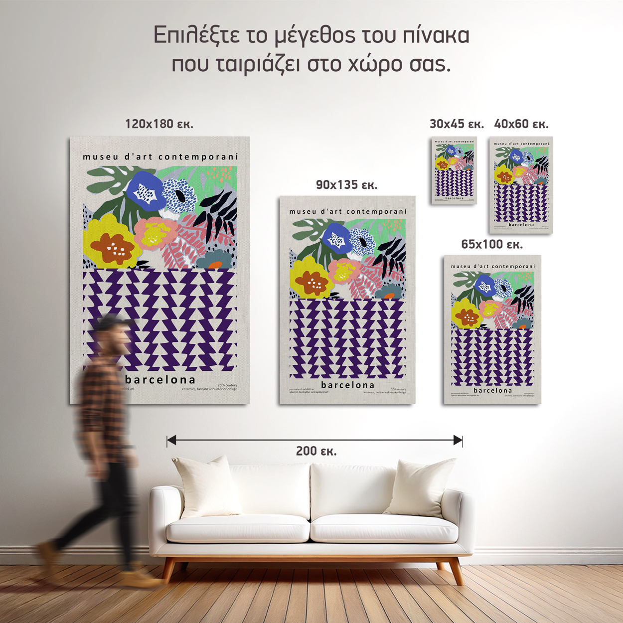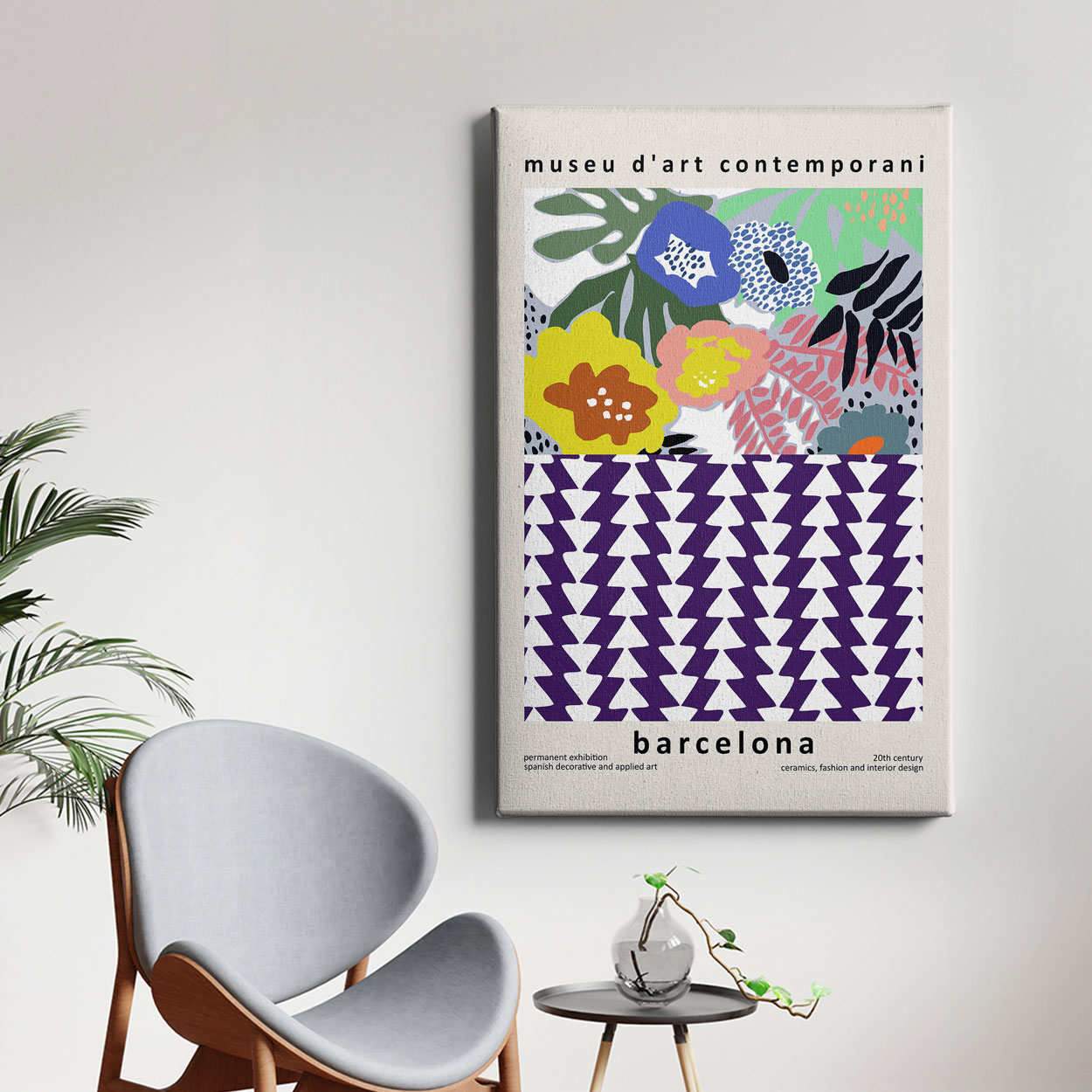Πίνακας Ζωγραφικής με μια εκλεπτυσμένη και πολυδιάστατη καλλιτεχνική αφίσα που αποτίει φόρο τιμής στην πλούσια καλλιτεχνική παράδοση της Βαρκελώνης και τον ισπανικό μοντερνισμό. Graphic Art εμπνευσμένο από την ισπανική διακοσμητική τέχνη του 20ου αιώνα, συνδυάζοντας στοιχεία από τον κόσμο των κεραμικών, της μόδας και του interior design. Ιδανική επιλογή για minimal σαλόνια, χώρους εργασίας ή eclectic εσωτερικούς χώρους. Ένα έργο που λειτουργεί ως ένα κομψό "cultural statement", φέρνοντας την αύρα των μεγάλων ευρωπαϊκών μουσείων απευθείας στον τοίχο σας.