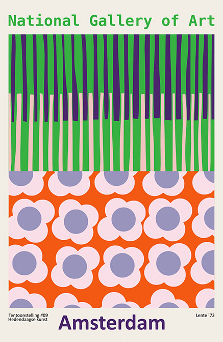 Πίνακας Ζωγραφικής με μια τολμηρή και γεωμετρική καλλιτεχνική αφίσα που συνδυάζει τη ρετρό αισθητική των 70s με τη μοντέρνα γραφιστική, φέρνοντας έναν αέρα ευρωπαϊκής γκαλερί στον χώρο σας. Μια στυλιζαρισμένη σύνθεση που θυμίζει αφίσα έκθεσης της "National Gallery of Art" στο Άμστερνταμ, χωρισμένη σε δύο μέρη: κάθετες ρίγες που παραπέμπουν σε δάσος και ένα έντονο φλοράλ μοτίβο στο κάτω μέρος. Ιδανική επιλογή για minimal ή eclectic σαλόνια, γραφεία και δημιουργικούς χώρους. Ένα έργο που λειτουργεί ως ένα σοφιστικέ χρωματικό statement, προσθέτοντας χαρακτήρα και καλλιτεχνική εγκυρότητα σε κάθε τοίχο.