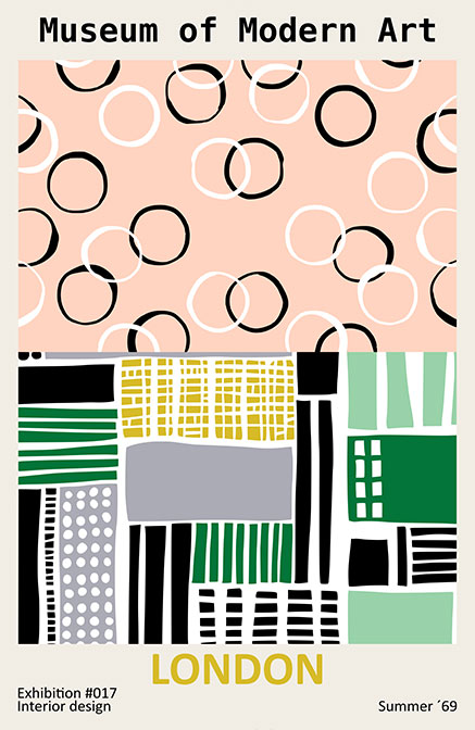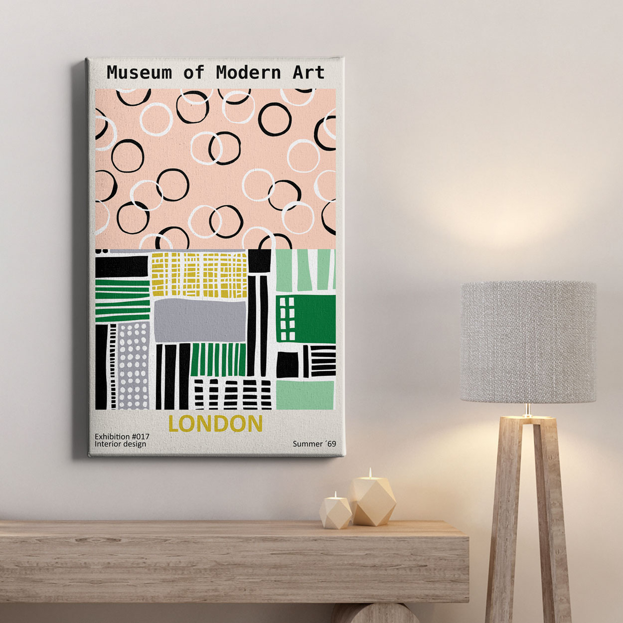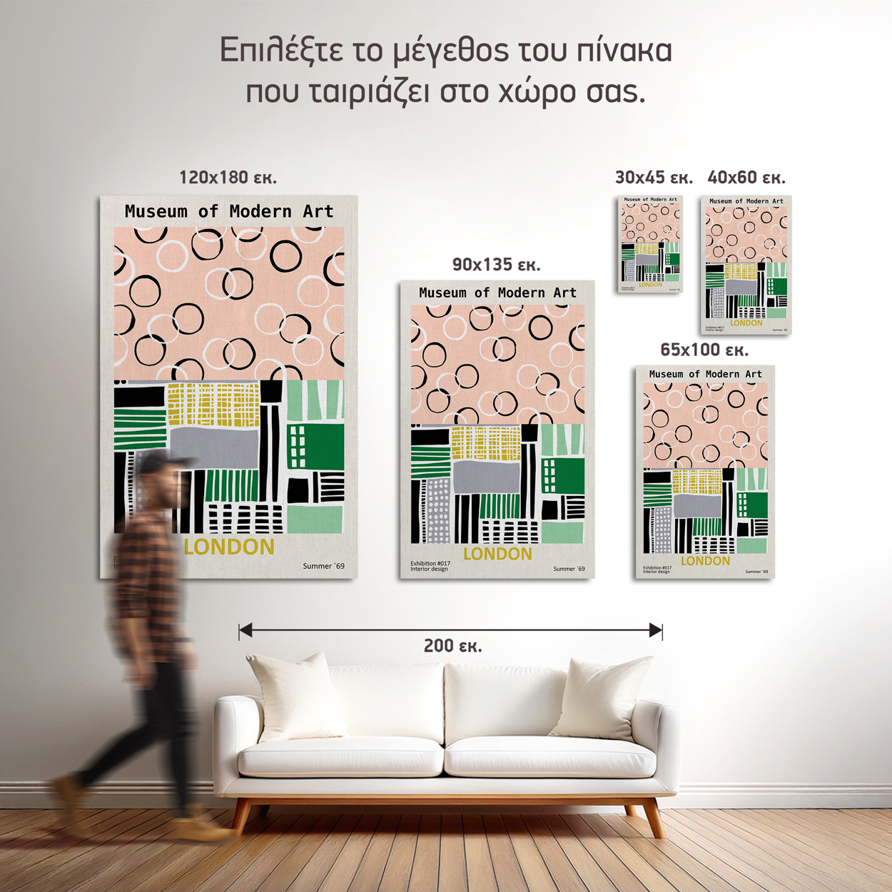 Πίνακας Ζωγραφικής με μια σοφιστικέ και πολυεπίπεδη καλλιτεχνική αφίσα που συνδυάζει τη γεωμετρική αυστηρότητα με την παιχνιδιάρικη διάθεση, φέρνοντας το στυλ των μεγάλων γκαλερί του Λονδίνου στον χώρο σας. Μια αφηρημένη σύνθεση "Museum of Modern Art" για την έκθεση του Λονδίνου (Summer '69), χωρισμένη σε δύο μέρη: μια ανάλαφρη σύνθεση με κύκλους στο επάνω μέρος και ένα σύνθετο γεωμετρικό πλέγμα με γραμμικά μοτίβα στο κάτω μέρος. Ιδανική επιλογή για minimal σαλόνια, επαγγελματικά γραφεία ή χώρους με vintage-modern επίπλωση. Ένα έργο που αποπνέει "European chic" αισθητική και καλλιτεχνική παιδεία.