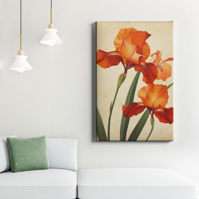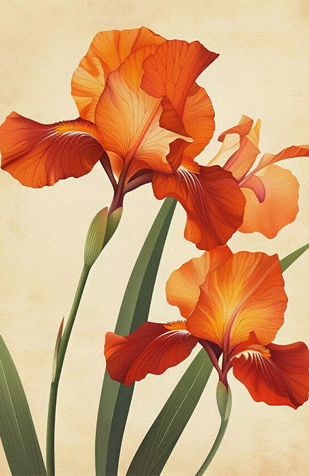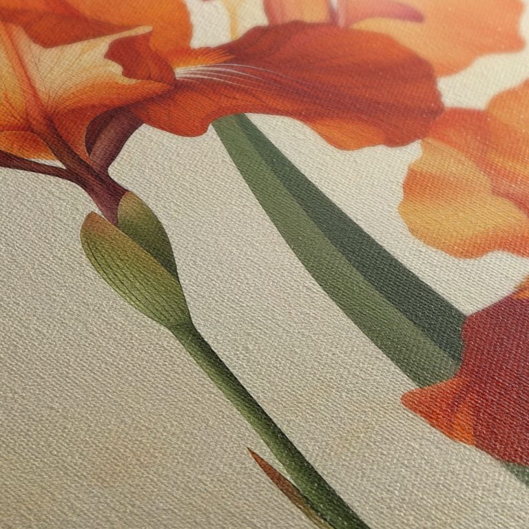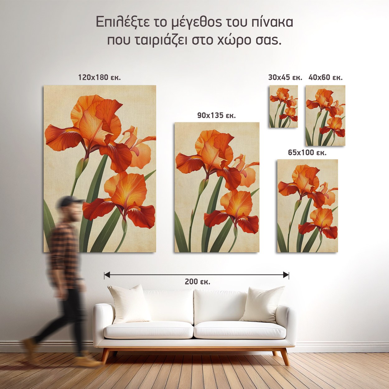 Ένα διαχρονικό έργο που υμνεί την ομορφιά της φύσης μέσα από έντονα χρώματα και λεπτομερή σχεδιασμό, ιδανικό για να προσθέσετε ζωντάνια και κλασική φινέτσα στον χώρο σας. Ζωντανό πορτοκαλί και βαθύ κεραμιδί που έρχονται σε τέλεια αντίθεση με το φυσικό πράσινο των μίσχων, πάνω σε ένα διακριτικό, ανάγλυφο μπεζ φόντο. Ένας συνδυασμός Vintage Botanical και Modern Nature στυλ. Ταιριάζει άψογα σε κλασικά ή μοντέρνα σαλόνια, τραπεζαρίες και χώρους που χρειάζονται ένα «θερμό» κεντρικό σημείο αναφοράς.