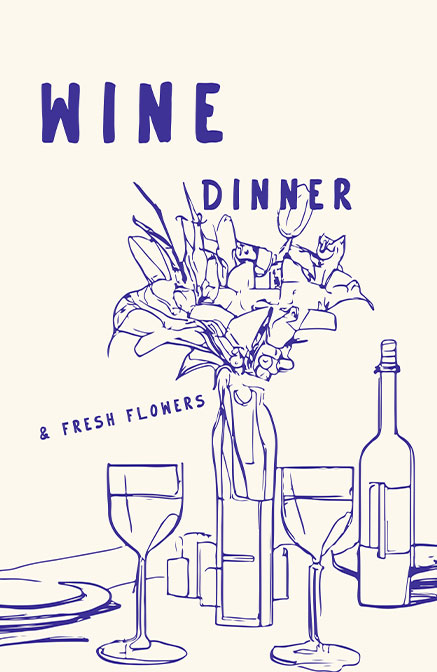 Πίνακας Ζωγραφικής με ένα κομψό και αφαιρετικό έργο που αιχμαλωτίζει την ουσία της καλής φιλοξενίας και της καθημερινής πολυτέλειας, ιδανικό για να προσθέσετε μια «bistro» αίσθηση στον χώρο σας. Μια μινιμαλιστική γραμμική απεικόνιση ενός στρωμένου τραπεζιού με δύο ποτήρια κρασιού, μια φιάλη και ένα πλούσιο μπουκέτο λουλούδια, συνοδευόμενη από τη χειρόγραφη επιγραφή "WINE DINNER & FRESH FLOWERS". Ιδανική επιλογή για την κουζίνα, την τραπεζαρία, ένα wine bar ή ένα εστιατόριο. Προσδίδει μια αίσθηση οικειότητας, ζεστασιάς και σοφιστικέ απλότητας στη διακόσμησή σας.