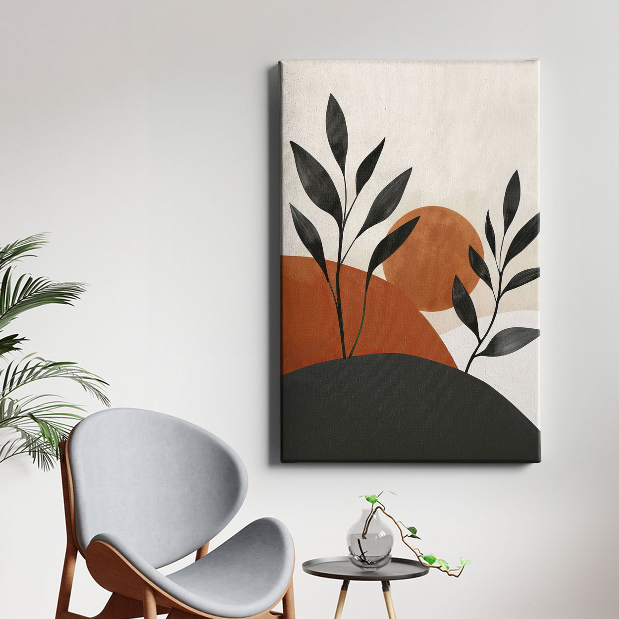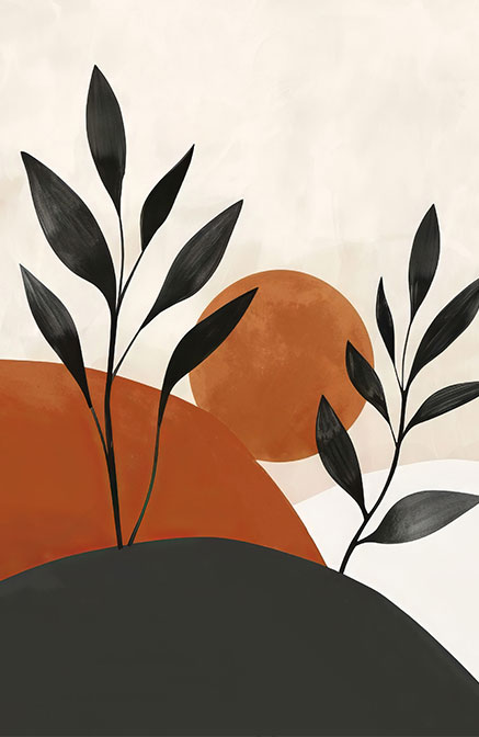 Πίνακας Ζωγραφικής με δύο κομψές σιλουέτες μαύρων κλαδιών προβάλλουν μπροστά από αφαιρετικούς λόφους και έναν επιβλητικό ήλιο, δημιουργώντας μια σύνθεση που ισορροπεί απόλυτα ανάμεσα στο μοντέρνο και το φυσικό. Η ιδανική επιλογή για διακόσμηση Modern Earthy, Mid-Century Modern ή Contemporary Boho. Λόγω των ζεστών του χρωμάτων, προσδίδει αμέσως μια αίσθηση θαλπωρής και ηρεμίας, καθιστώντας τον πίνακα τέλειο για το σαλόνι, την τραπεζαρία ή το υπνοδωμάτιο.