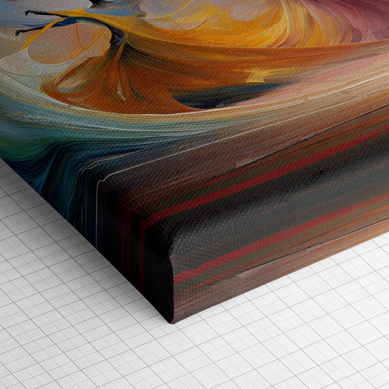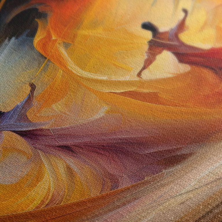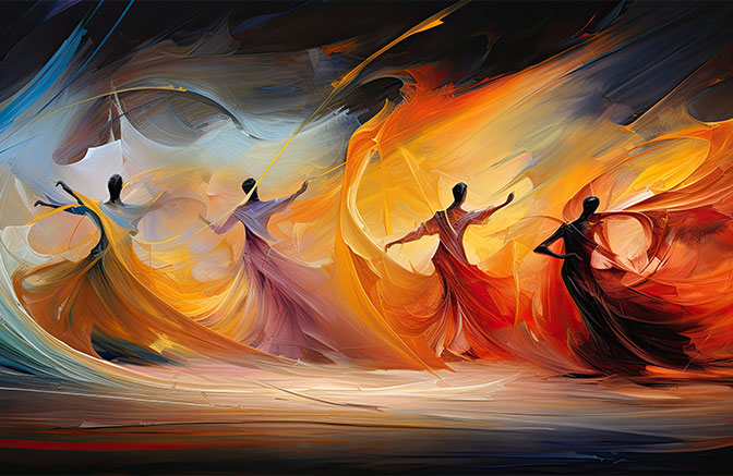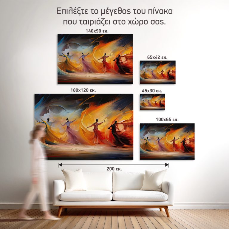 Αφηρημένες σιλουέτες χορευτριών με ρευστά περάσματα σε πορτοκαλί, κόκκινο και μπλε. Έντονη κίνηση και ενέργεια, αισθητική σαν φλόγες και μετάξι. Ιδανικό για σαλόνι, στούντιο χορού ή μοντέρνους χώρους.