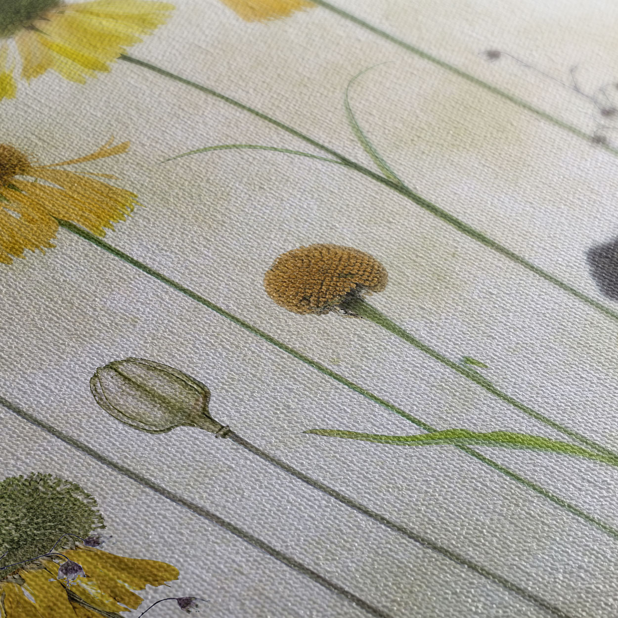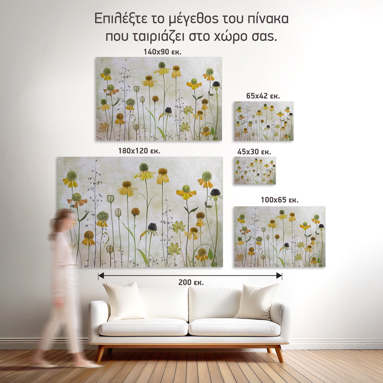 Απαλή, φυσική σύνθεση με κίτρινες αποχρώσεις και vintage αίσθηση. Ένας κομψός πίνακας που αναδεικνύει τη λεπτότητα των αγριολούλουδων. Η απαλότητα των χρωμάτων και η ελαφριά υφή στο φόντο δημιουργούν μια γαλήνια, νοσταλγική ατμόσφαιρα, ιδανικός για σαλόνι, υπνοδωμάτιο ή χώρους υποδοχής που ζητούν φυσική, διακριτική ομορφιά.