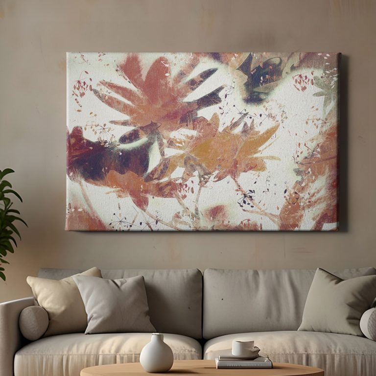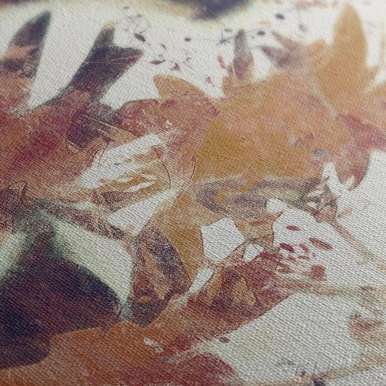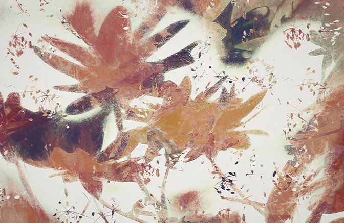Αφαιρετικές φυτικές μορφές αναδύονται σε απαλό φως, σαν ανάσα που διαλύεται στον χώρο. Θερμές τονικότητες και ρυθμικές κινήσεις γεννούν ήρεμη, ονειρική ατμόσφαιρα.