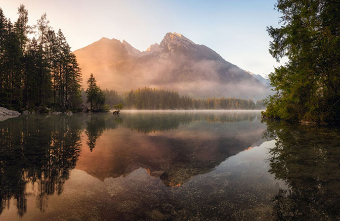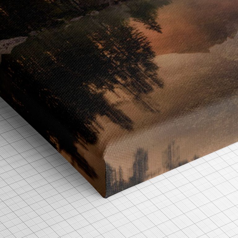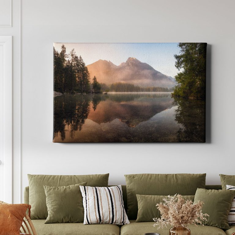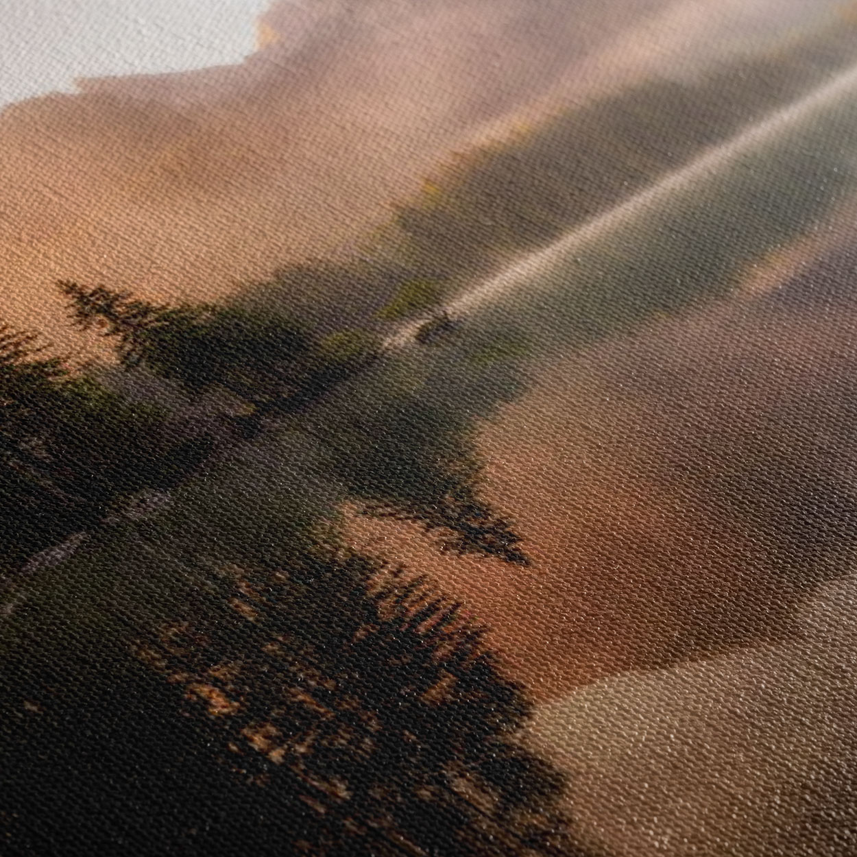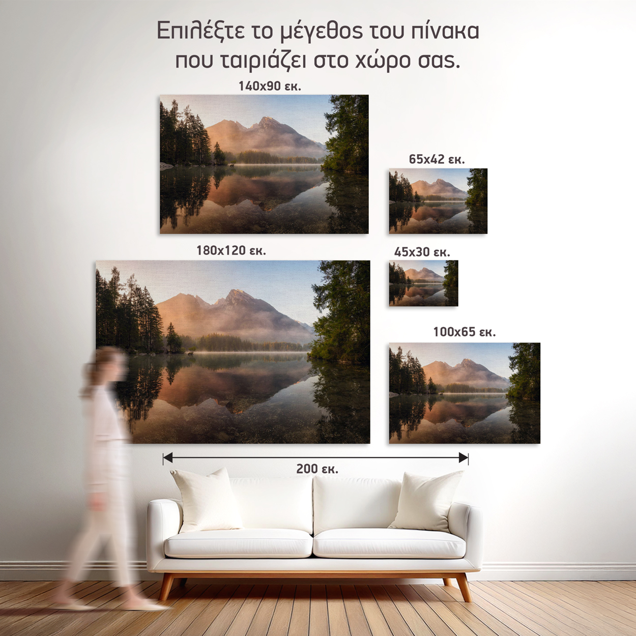 Εκπληκτικός πίνακας που απεικονίζει μια παραδεισένια αλπική λίμνη καλυμμένη από την πρώτη πρωινή ομίχλη. Η σκηνή αιχμαλωτίζει τη μαγική στιγμή της ανατολής, όπου τα χρυσαφένια φώτα αγκαλιάζουν τις βουνοκορφές και δημιουργούν μια ατμόσφαιρα απόλυτης γαλήνης. Τα ψηλά κωνοφόρα δέντρα στις όχθες πλαισιώνουν τέλεια τη σύνθεση, ενώ οι αντανακλάσεις στα κρυστάλλινα νερά της λίμνης δημιουργούν μια εντυπωσιακή συμμετρία. Η ζεστή χρωματική παλέτα με χρυσαφένιες, ροζ και πορτοκαλί αποχρώσεις αντιπαραβάλλεται αρμονικά με τους σκούρους πράσινους τόνους του δάσους. Η λεπτή ομίχλη που αιωρείται πάνω από τα βουνά προσθέτει μυστήριο και ρομαντισμό. Ιδανικός για χώρους που χρειάζονται ηρεμία και σύνδεση με τη φύση.