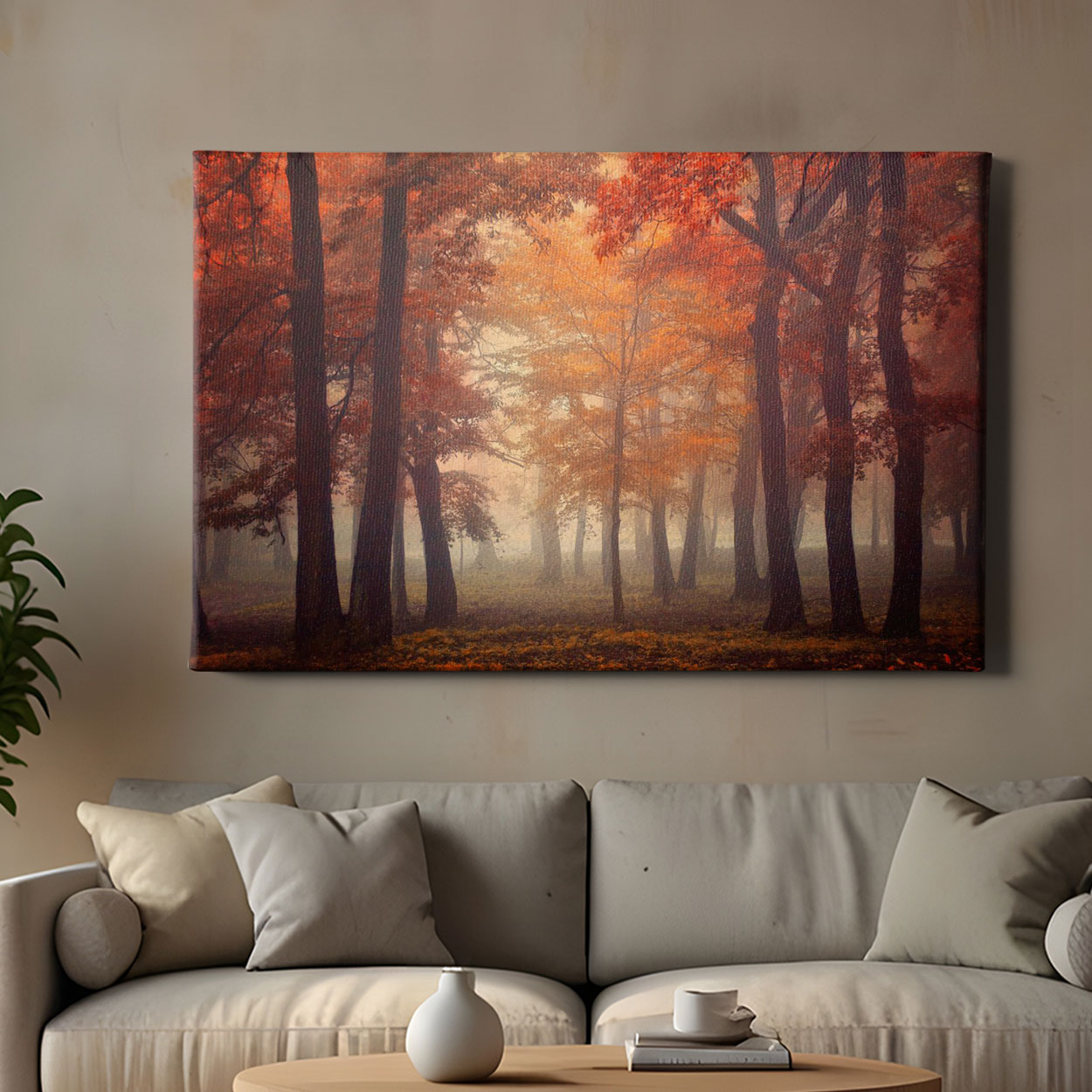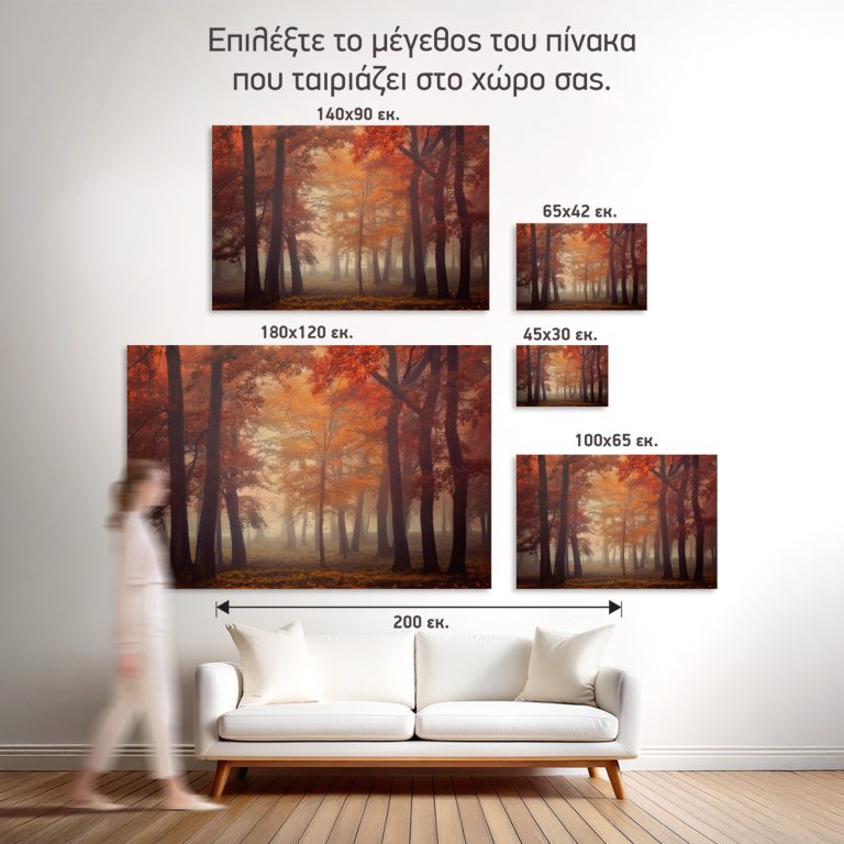 Ένα μαγευτικό φθινοπωρινό τοπίο, όπου το δάσος ντύνεται σε τόνους του κεχριμπαριού, της σκουριάς και του χρυσού, ενώ μια απαλή ομίχλη αγκαλιάζει τα δέντρα και δημιουργεί μια αίσθηση μυσταγωγίας. Αυτός ο πίνακας ζωγραφικής προσφέρει στον χώρο σου μια σιωπηλή, φυσική ισορροπία, ενώ παράλληλα εμπνέει εσωτερική ηρεμία και νοσταλγία για τη γλυκιά μελαγχολία του φθινοπώρου. Ιδανικό για Καθιστικά με φυσικά στοιχεία, εργασιακούς χώρους με ανάγκη για γαλήνια ατμόσφαιρα, σπίτια με country, boho ή hygge διακόσμηση αλλά και εξοχικές κατοικίες και Airbnb με στοιχεία της φύσης.