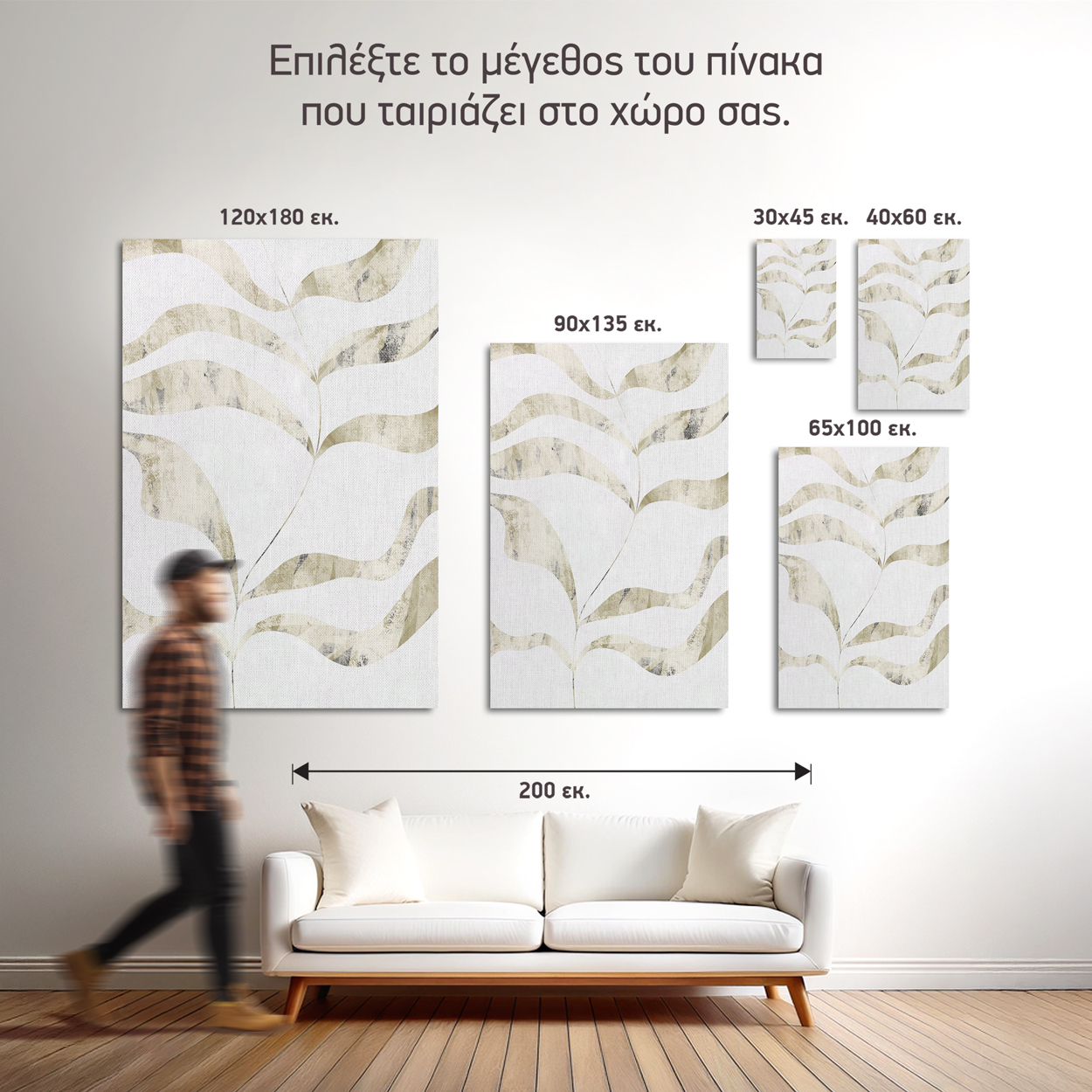 Ένας κομψός πίνακας ζωγραφικής που αποτυπώνει την ευαίσθητη και αέρινη κίνηση των φύλλων, καθώς κυματίζουν απαλά, σαν να τα παρασέρνει ένα ελαφρύ αεράκι. Η σύνθεση αποπνέει ηρεμία, φυσική ροή και ελευθερία, ενώ τα καμπύλα σχήματα και οι απαλές γραμμές δημιουργούν μια αίσθηση χαλάρωσης και ισορροπίας. Ιδανικό έργο για χώρους που χρειάζονται ένα φυσικό αλλά μοντέρνο στοιχείο διακόσμησης.
