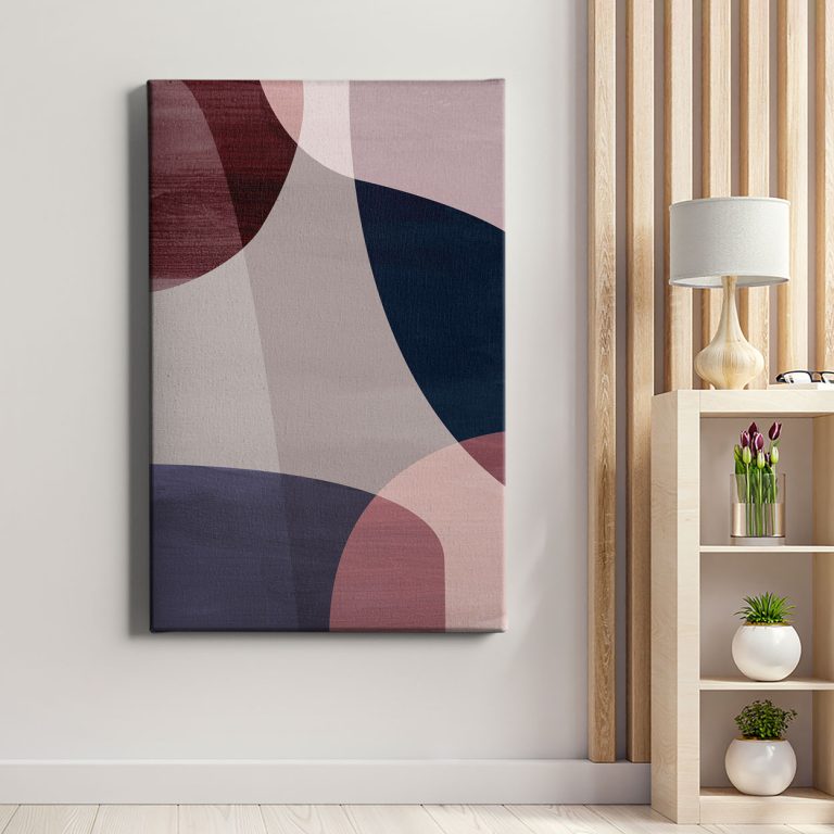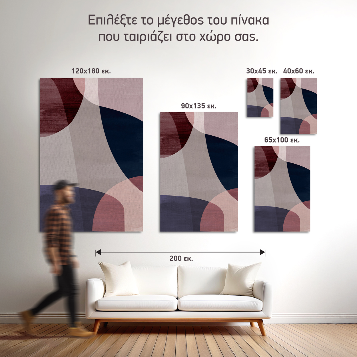 Πίνακας Ζωγραφικής με μινιμαλιστική σύνθεση που παίζει με διαφανείς στρώσεις και καθαρές γεωμετρικές φόρμες. Οι απαλοί ροζ και μπλε τόνοι και οι καμπύλες δημιουργούν αρμονία και κομψή απλότητα, ιδανική για σαλόνι, υπνοδωμάτιο ή γραφείο.