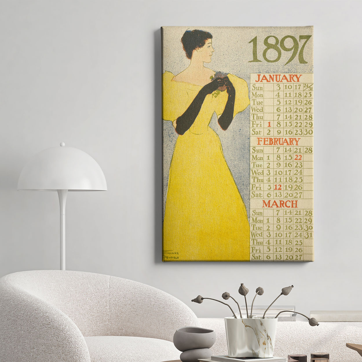 Οι πίνακες ζωγραφικής που απεικονίζουν το έργο του Penfield ο οποίος θεωρείται σημαντικός στον τομέα του γραφιστικού σχεδιασμού και έχει επηρεάσει πολλές γενιές σχεδιαστών και καλλιτεχνών, θα ανανεώσουν το χώρο σας φέρνοντας την αισθητική της εποχής. Το ημερολόγιο του 1897 περιλαμβάνει καλλιτεχνικά στοιχεία που απεικονίζουν τους μήνες του έτους, συνοδευόμενα από λεπτομερή σχέδια και χρώματα που άντλησε από την καθημερινή ζωή και τη γυναικεία μορφή.