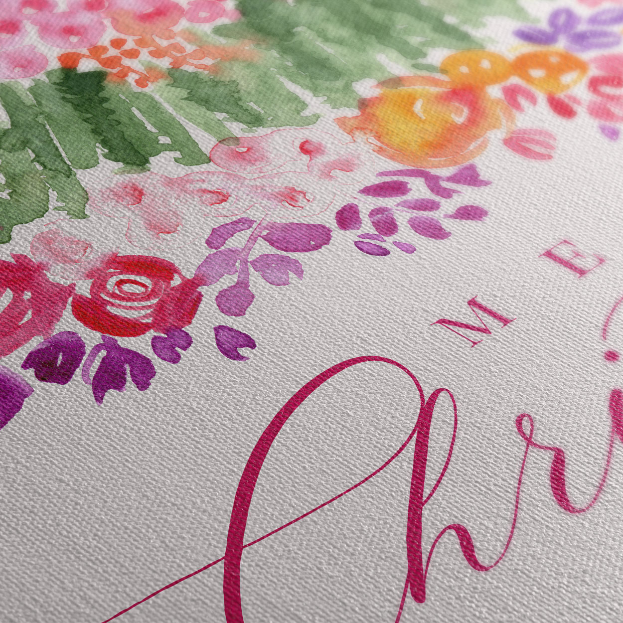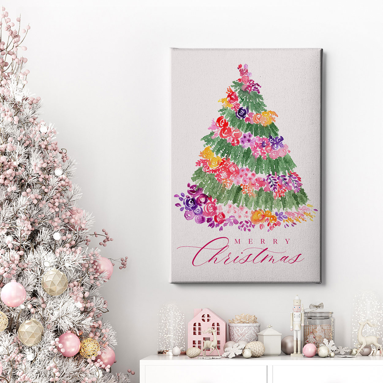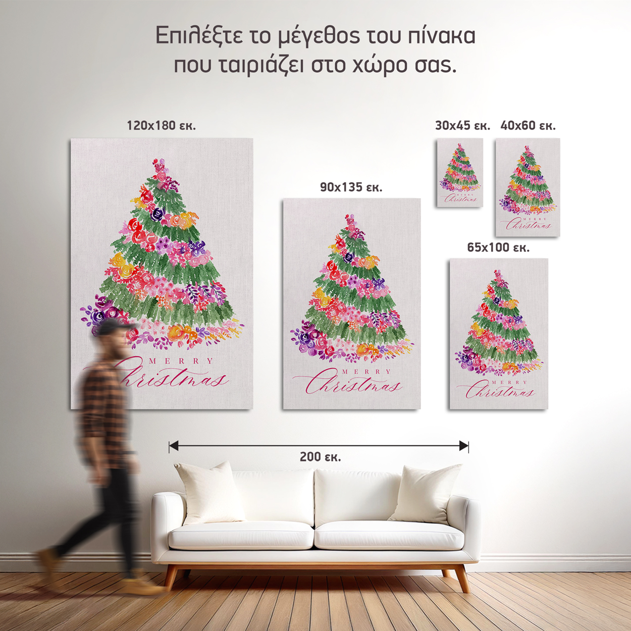 Ένας χρωματιστός, παιχνιδιάρικος πίνακας Χριστουγέννων με ένα δεντράκι με λουλούδια για στολίδια σε φωτεινά ροζ, κοραλλί και πράσινα χρώματα που σχηματίζουν ένα γλυκό, εορταστικό σχήμα. Η επιγραφή “Merry Christmas” προσθέτει κομψότητα και ρομαντική διάθεση. Ιδανικός για σαλόνια, υπνοδωμάτια ή βιτρίνες που θέλουν ένα φρέσκο και μοντέρνο χριστουγεννιάτικο άγγιγμα.