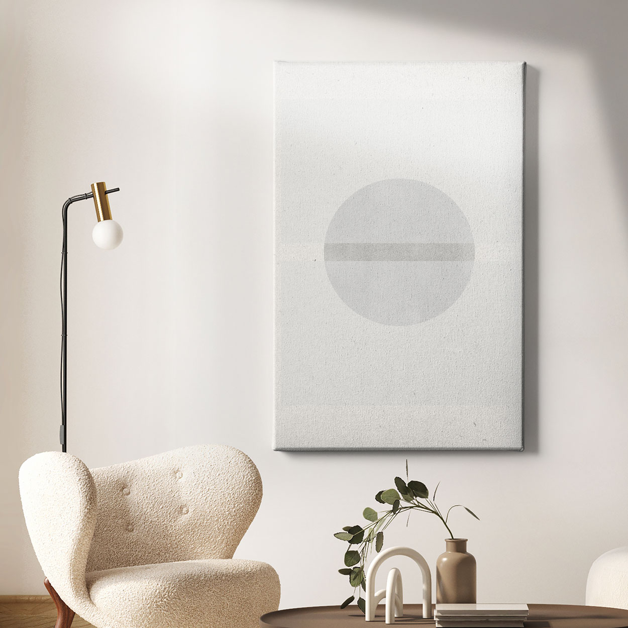 Μινιμαλιστικός αφηρημένος πίνακας με έμφαση στην απλότητα και την ισορροπία. Ένας απαλός γκρι κύκλος με εσωτερική σκούρα γραμμή ξεχωρίζει πάνω σε λευκό φόντο, εμπνευσμένο από το Cloud Dancer, το χρώμα της χρονιάς 2026 της Pantone. Μια σύνθεση που εκφράζει ηρεμία, εστίαση και την ομορφιά του ουσιώδους. Ιδανικός για σύγχρονους χώρους που αναζητούν καθαρές γραμμές και διαχρονική κομψότητα.