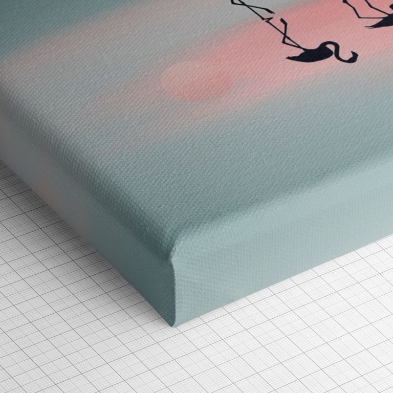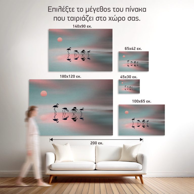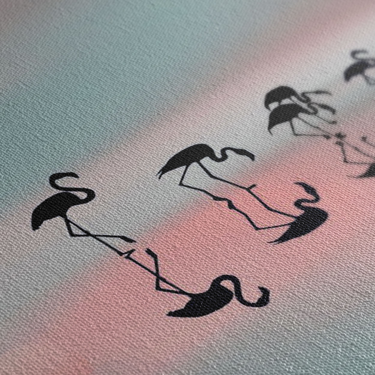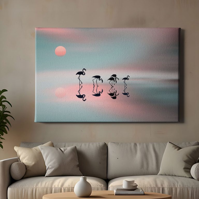 Ονειρικός πίνακας ζωγραφικής με θέμα τα φλαμίνγκο σε ένα μαγευτικό ηλιοβασίλεμα. Το έργο παρουσιάζει τέσσερα φλαμίνγκο σε σιλουέτα που στέκονται στα ρηχά νερά, με τις αντανακλάσεις τους να δημιουργούν μια τέλεια συμμετρία. Τα απαλά χρώματα του ηλιοβασιλέματος, ροζ, τυρκουάζ, πορτοκαλί, αναμειγνύονται όμορφα, δημιουργώντας μια ρομαντική, zen ατμόσφαιρα. Ο απαλός ήλιος στον ορίζοντα προσθέτει ζεστασιά στη σκηνή. Η minimalist σύνθεση και τα dreamy χρώματα καθιστούν τον πίνακα ιδανικό για χώρους που χρειάζονται γαλήνη και τροπικό στυλ.