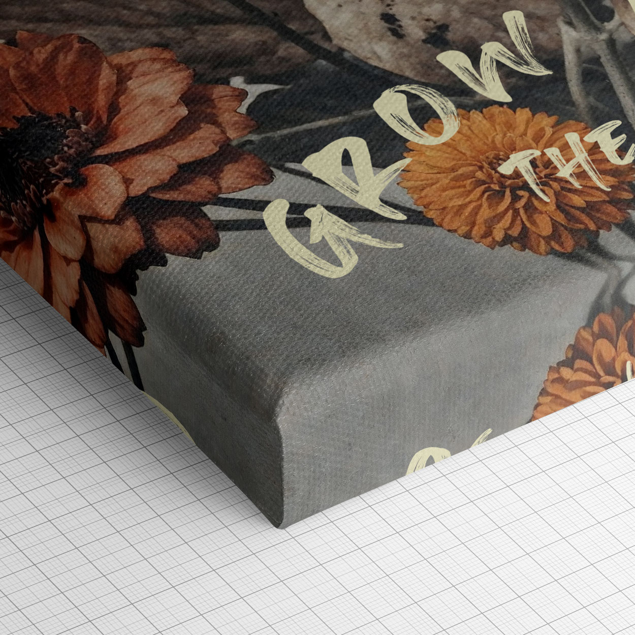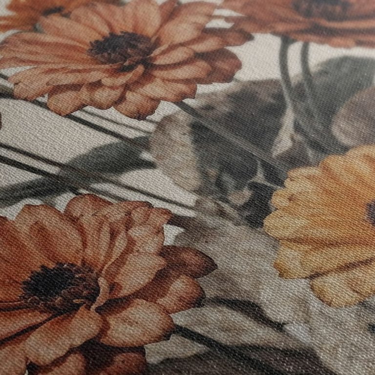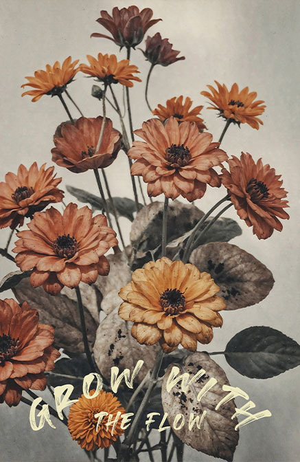 Μια λιτή σύνθεση με ζεστούς, κεραμιδί τόνους, τα άνθη σαν να θυμούνται το φως του καλοκαιριού, ενώ τα φύλλα φέρουν την τρυφερή φθορά του χρόνου.