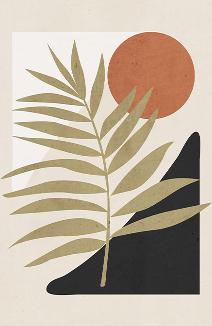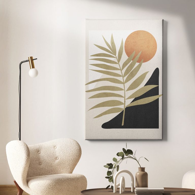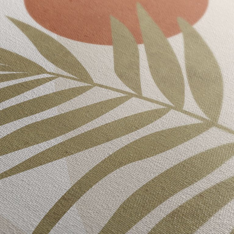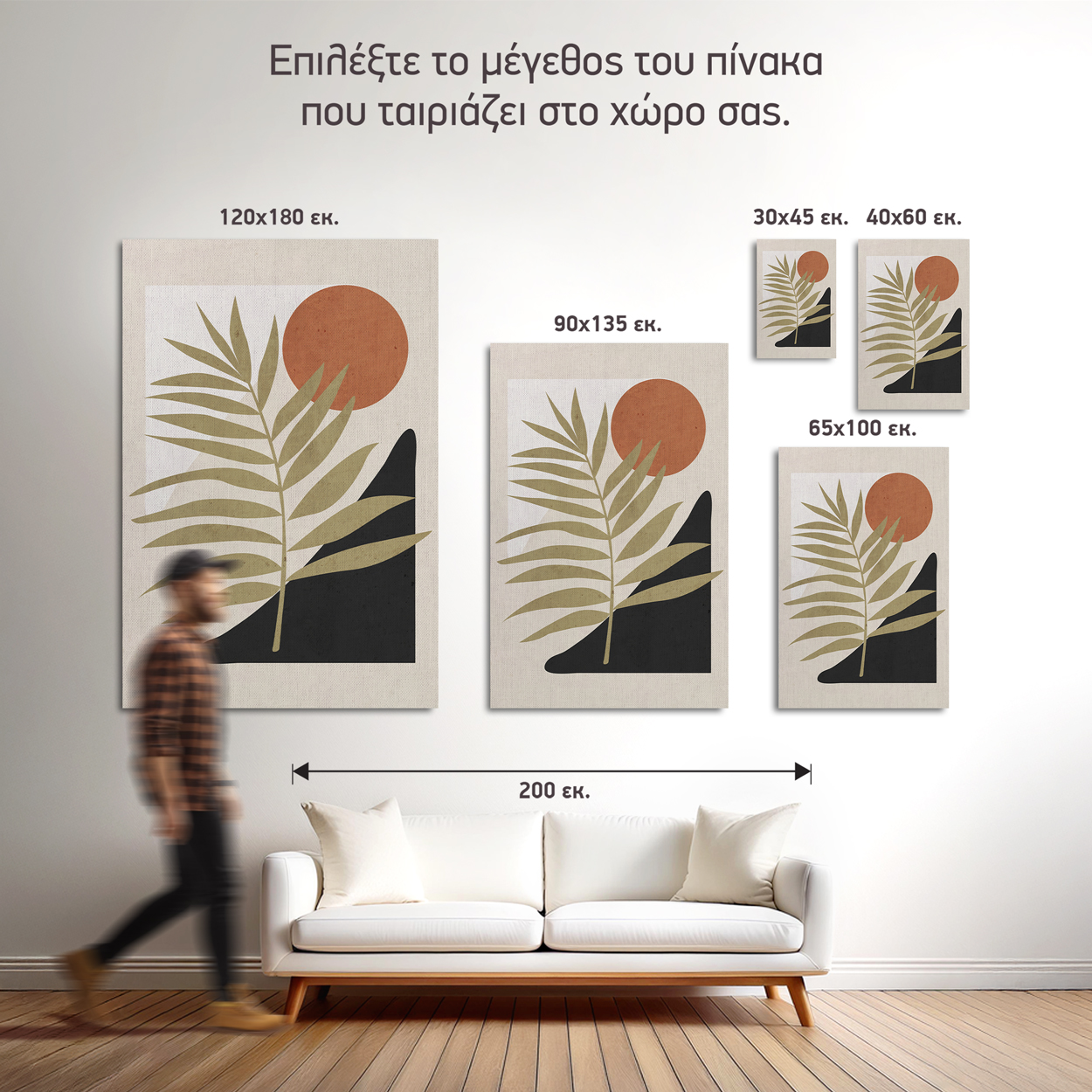 Πίνακας ζωγραφικής μινιμαλ που παίζει με την αντίθεση μεταξύ φύλλων και απλών γεωμετρικών στοιχείων: λεπτό φύλλο, καθαρό τετράγωνο φόντο και ένας θερμός ήλιος. Η ήπια υφή και η γήινη παλέτα δημιουργούν αίσθηση ισορροπίας και ζεστασιάς, κατάλληλη για μοντέρνες και σκανδιναβικές διακοσμήσεις.