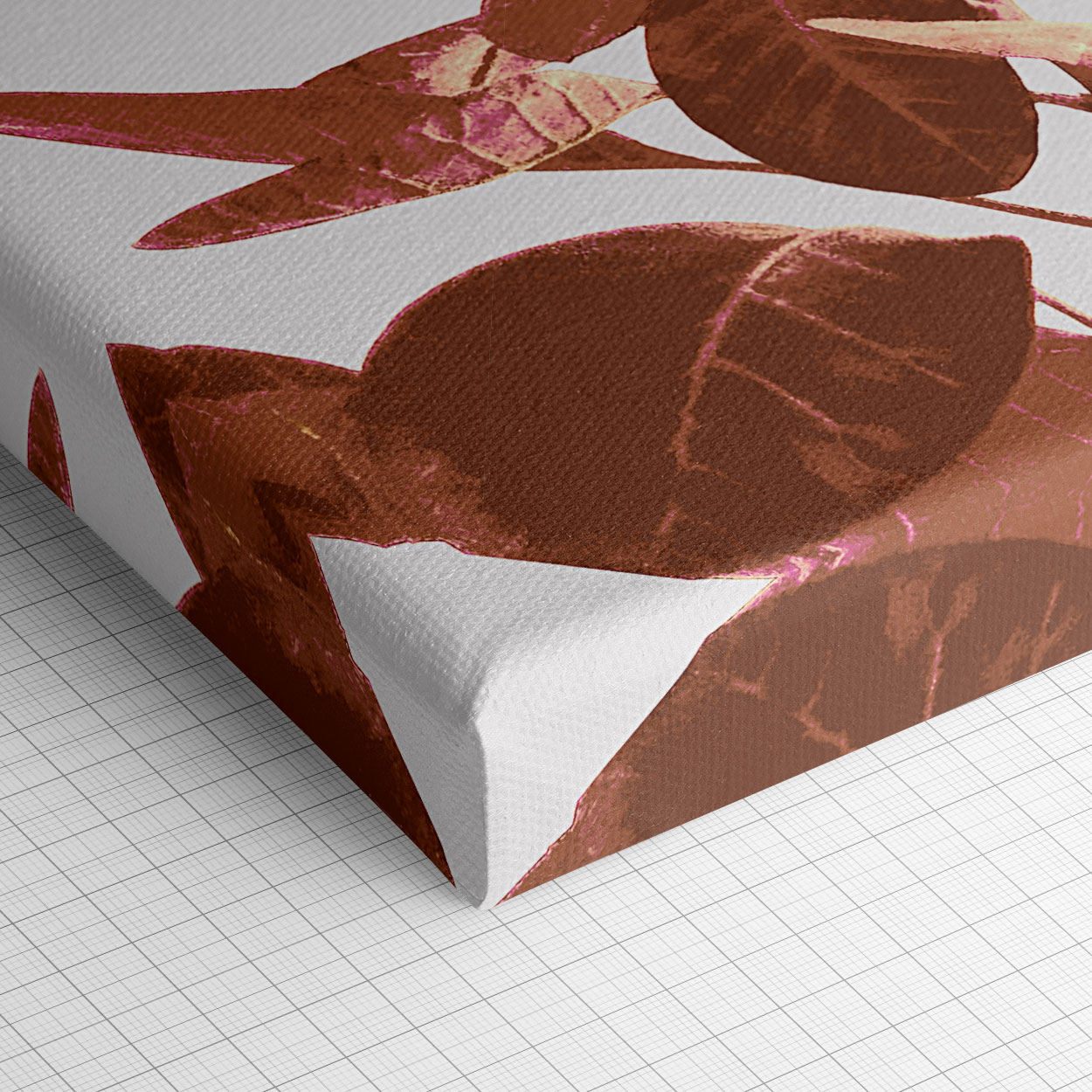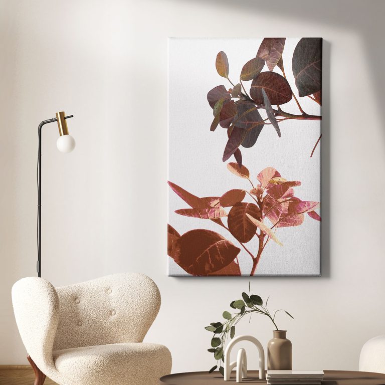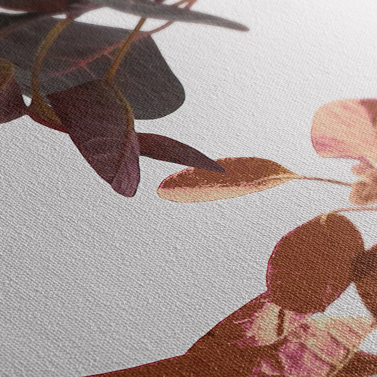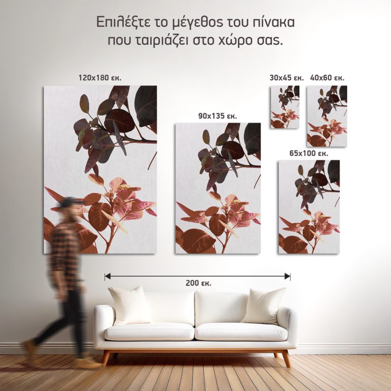 Κομψός πίνακας ζωγραφικής σε σύγχρονο μινιμαλιστικό στυλ που απεικονίζει φυσικά στοιχεία. Τα φύλλα και κλαδιά παρουσιάζονται σε πλούσιους καφέ και ροζ τόνους που δημιουργούν αίσθηση ηρεμίας και σοφιστικέ αισθητική. Το καθαρό άσπρο φόντο τονίζει την ομορφιά της φύσης και προσδίδει μοντέρνα κομψότητα.