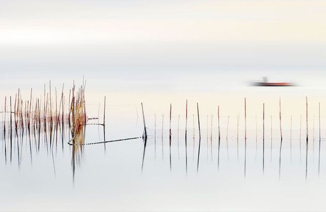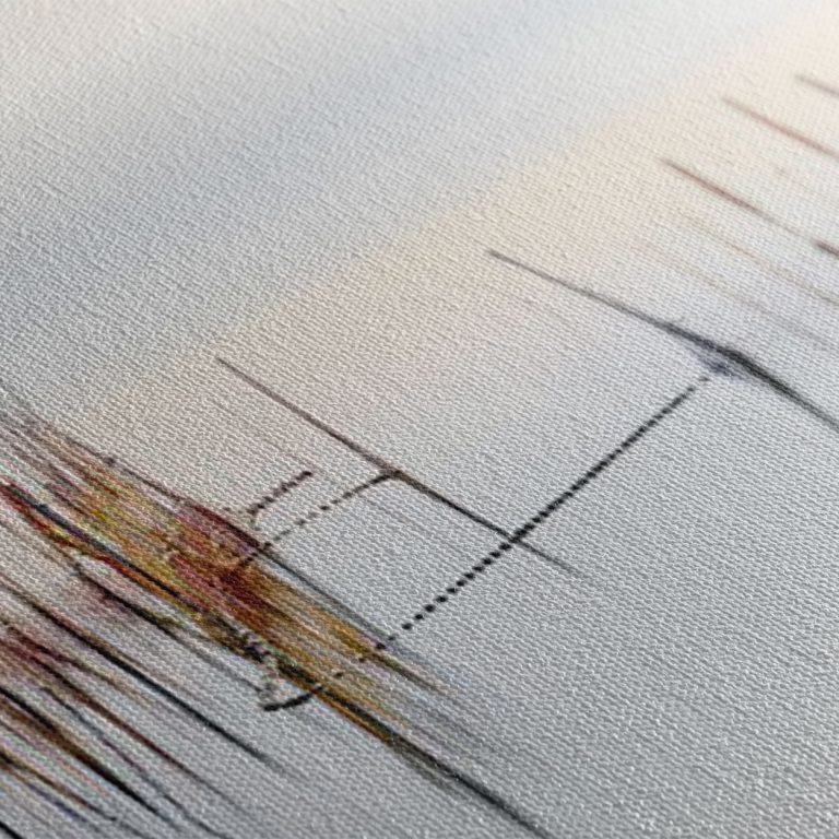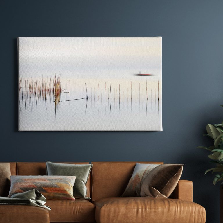 Πίνακας ζωγραφικής με θέμα τα γαλήνια νερά και τις κάθετες αντανακλάσεις. Το έργο παρουσιάζει μια ήρεμη λιμνάδα με λεπτά κάλαμα ή στύλους ψαρέματος που αντανακλώνται τέλεια στην ακίνητη επιφάνεια του νερού. Στο background διακρίνεται μια θολή βάρκα που προσθέτει κίνηση στη στατική σκηνή. Η minimalist σύνθεση με τα neutral χρώματα λευκό, γκρι, μπεζ, δημιουργεί μια zen, contemplative ατμόσφαιρα που προσκαλεί σε εσωτερική γαλήνη. Η τέλεια συμμετρία των αντανακλάσεων ενισχύει την αίσθηση της αρμονίας και της ισσοροπίας.