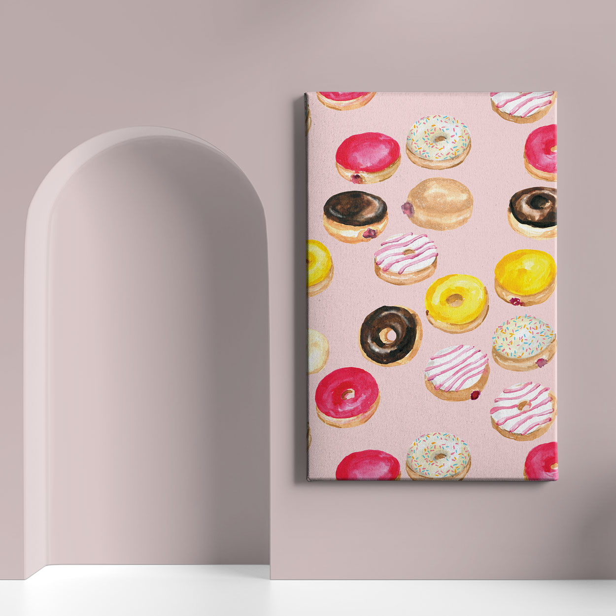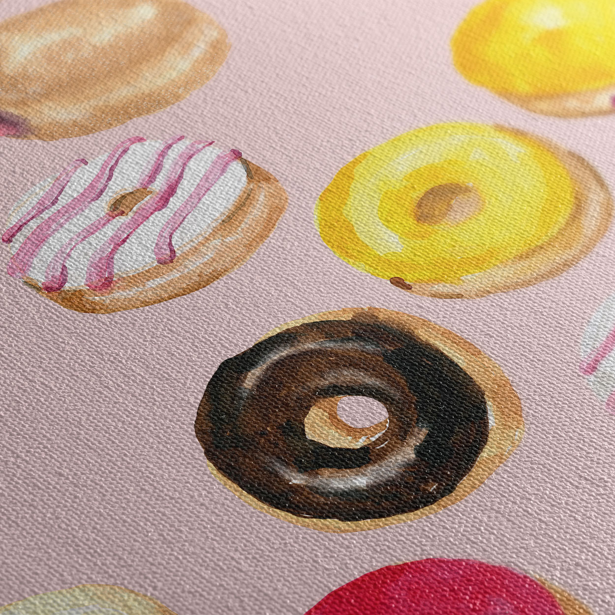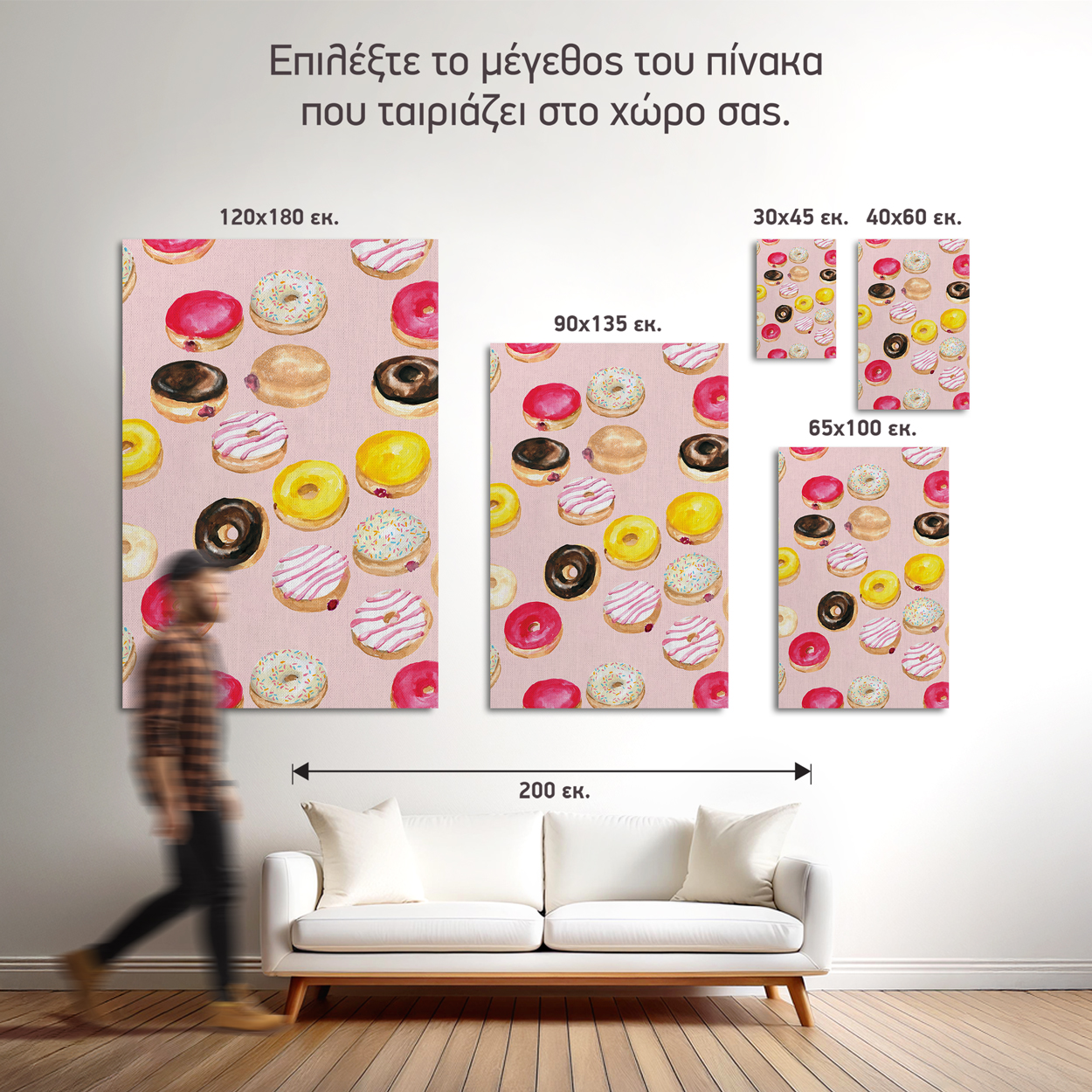 Ένας παιχνιδιάρικος και γεμάτος χρώμα πίνακας με ροζ φόντο και πολλά ντόνατς σε διάφορες γεύσεις και σχέδια,με πολύχρωμες τρούφες, σοκολάτα, φράουλα, γλάσο και άλλα λαχταριστά toppings. Η σύνθεση αποπνέει θετική ενέργεια, νεανική διάθεση και ανεμελιά, κάνοντάς τον ιδανικό για κουζίνες, ζαχαροπλαστεία, καφέ, παιδικά δωμάτια ή χώρους που θέλουν να προκαλούν χαμόγελα. Ένα έργο που ξυπνά τις αισθήσεις και... την όρεξη!