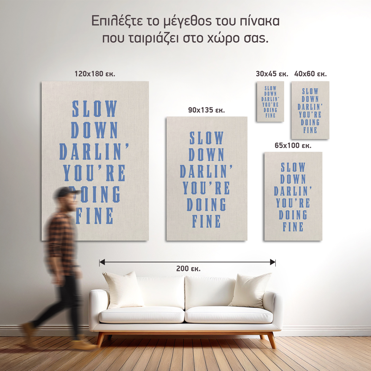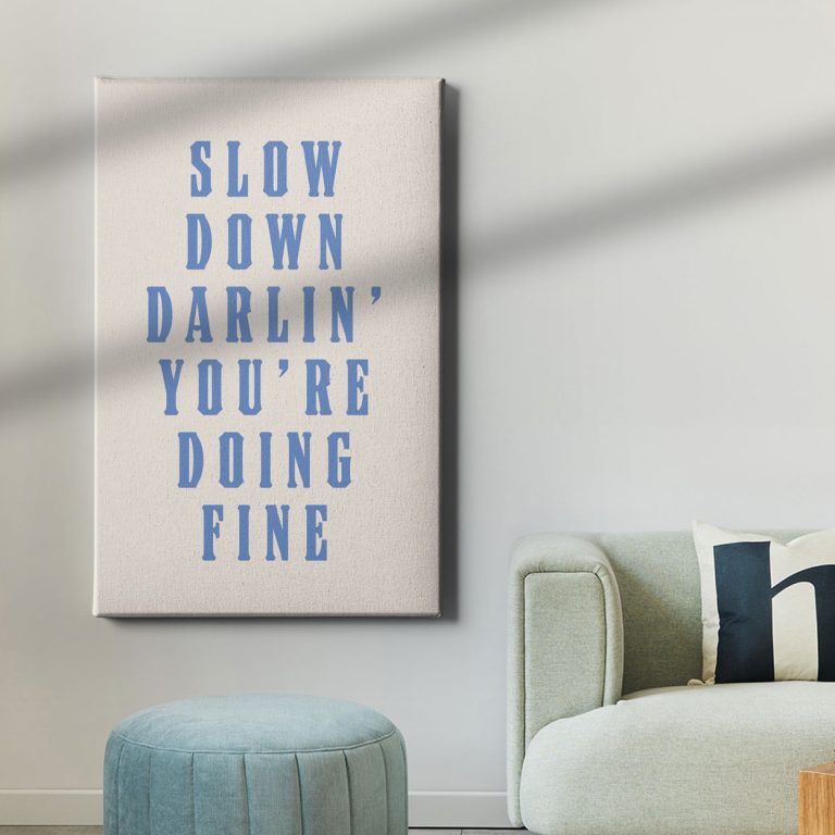 Μια γλυκιά, ενθαρρυντική φράση που λειτουργεί σαν καθημερινή υπενθύμιση: "Slow down darlin', you're doing fine." Ιδανικός λεκτικός καμβάς για όσους χρειάζονται μια ανάσα ανάμεσα στο χάος της καθημερινότητας. Με απλή, καθαρή αισθητική και τρυφερό τόνο, ο πίνακας αυτός φέρνει ζεστασιά και νοιάξιμο στον χώρο, είτε τοποθετηθεί σε υπνοδωμάτιο, σαλονάκι ή ακόμα και σε χώρο εργασίας.