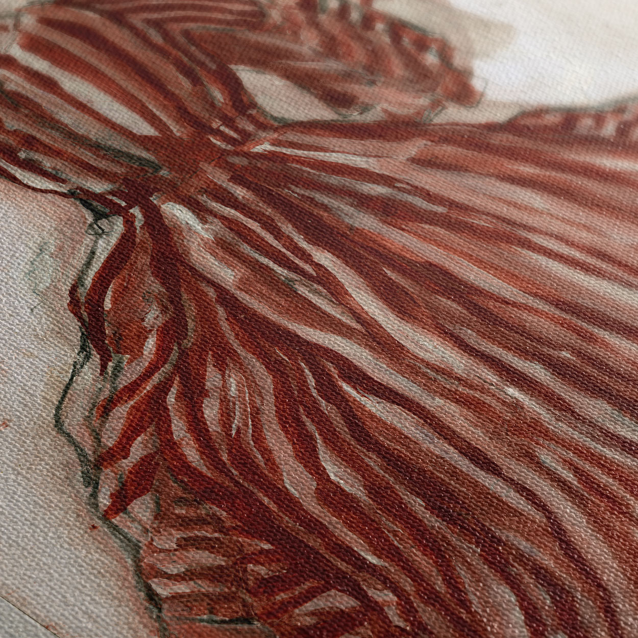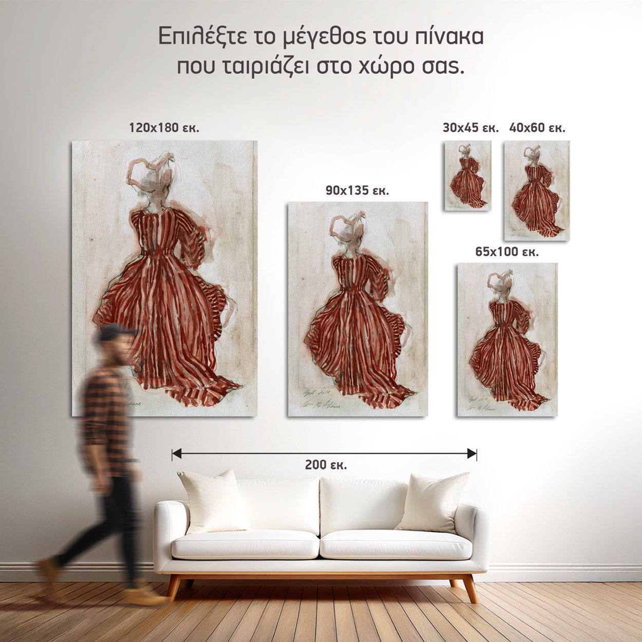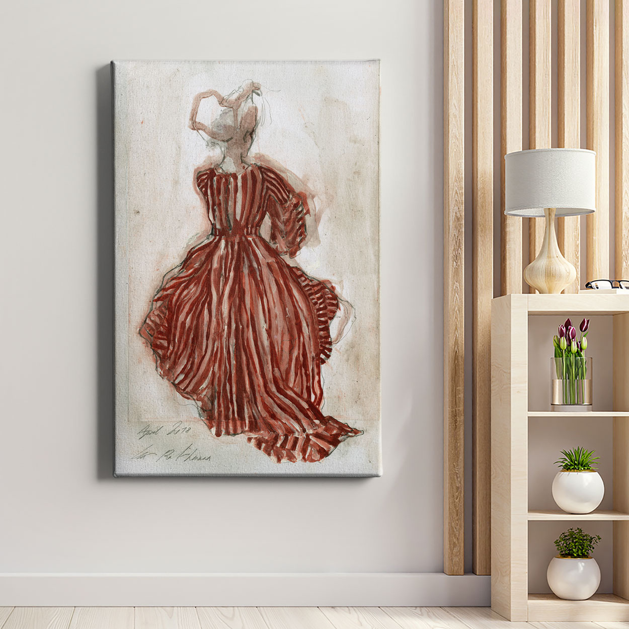 Ένας καμβάς που αποτυπώνει την κομψότητα της σιωπής και τη γοητεία του άγνωστου. Η πλάτη μιας γυναίκας ντυμένης με ένα βαθύ κόκκινο, vintage φόρεμα, στέκεται σε μια στιγμή ηρεμίας, λίγο πριν γυρίσει να κοιτάξει. Το έντονο κόκκινο τονίζει τη θηλυκότητα, ενώ η vintage αισθητική προσθέτει έναν αέρα νοσταλγίας και διαχρονικής κομψότητας. Ιδανικό για σαλόνια, χωλ ή υπνοδωμάτια, concept καταστήματα, boutique και studio μόδας αλλά και χώρους που επιζητούν ένα διακριτικό θηλυκό στοιχείο.