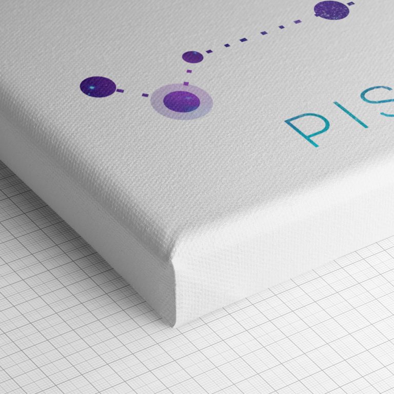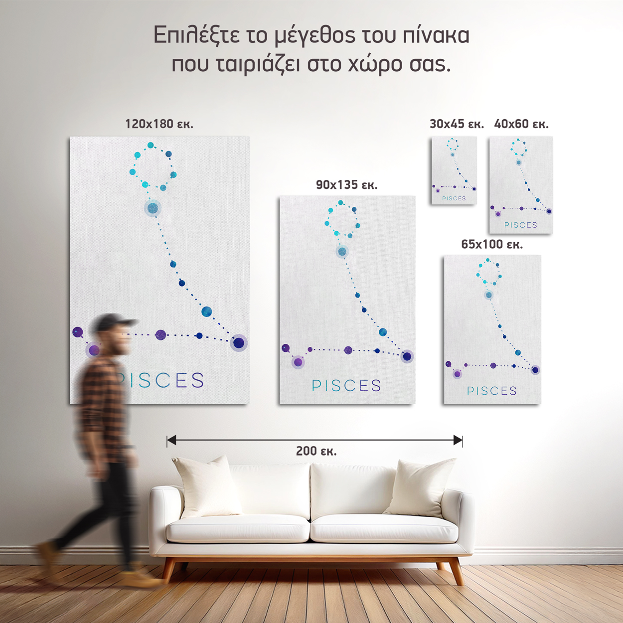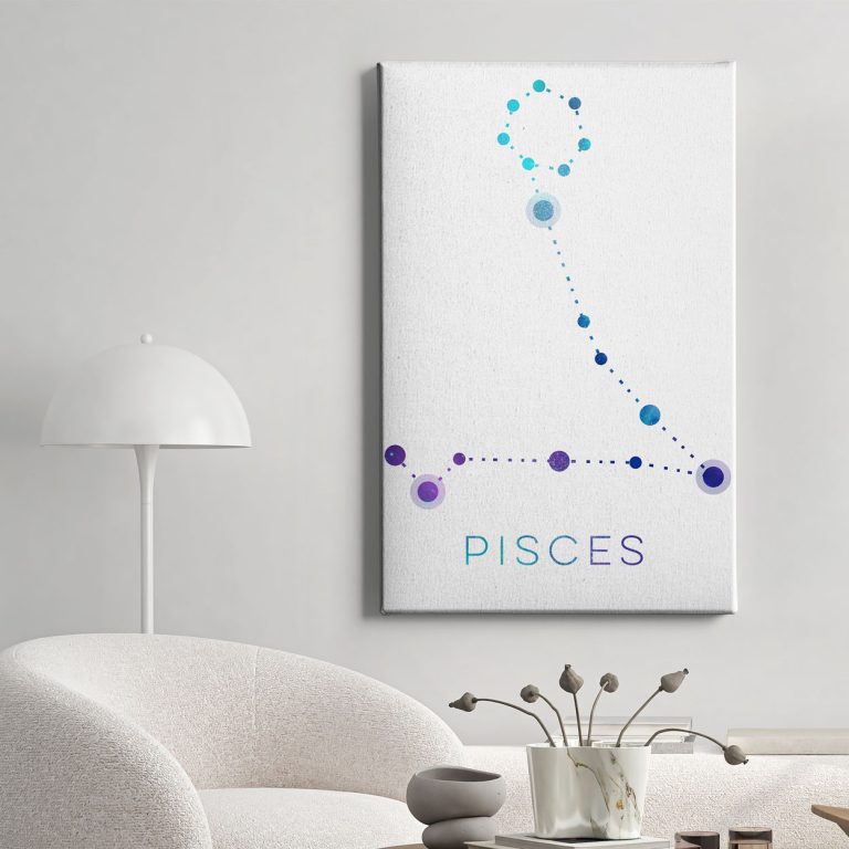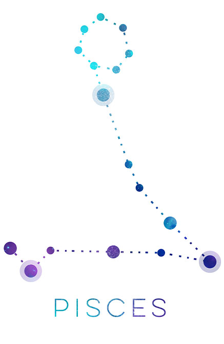 Ο πίνακας αυτός αποτυπώνει τον αστερισμό των Ιχθύων σαν οπτικό ποίημα, δύο γραμμές φωτός που ελίσσονται και συνδέονται, σχηματίζοντας έναν ήρεμο χορό στον λευκό καμβά. Τα αστέρια, παρουσιάζονται ως κύκλοι και μοιάζουν με φάρους, ενώ οι μικρές κουκκίδες που τα ενώνουν λειτουργούν σαν σταγόνες ή ρεύματα και υπογραμμίζουν την αίσθηση ροής και συναισθηματικής σύνδεσης