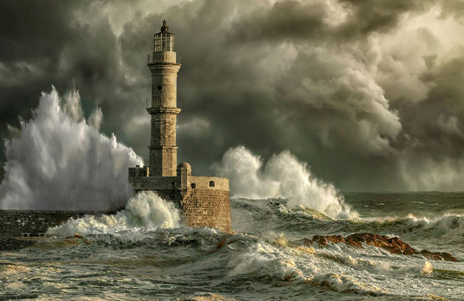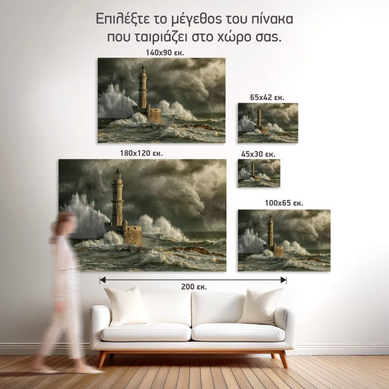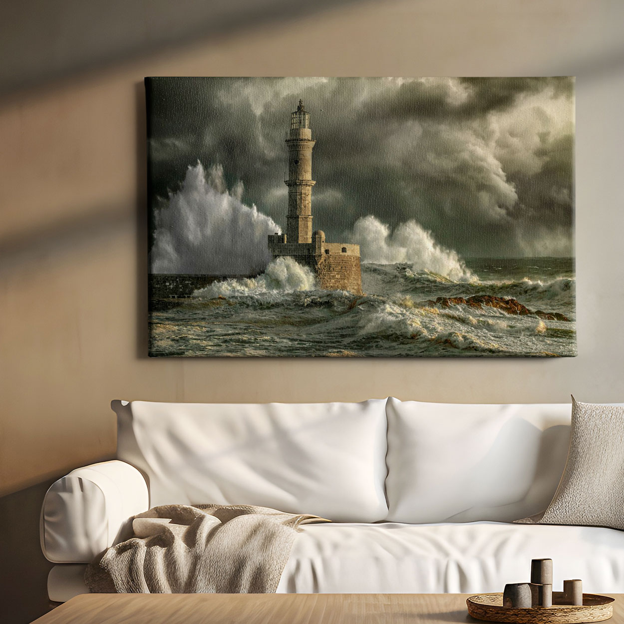 Οι πίνακες ζωγραφικής που απεικονίζουν τα μεγάλα κύματα γύρω από τον άγρυπνο φάρο των Χανίων θα ανανεώσουν το χώρο σας με την ακαταμάχητη θέα. Η καταιγίδα είναι μια σκηνή τόσο σφοδρή και όμορφη, που προκαλεί δέος και θαυμασμό για τη δύναμη της φύσης.