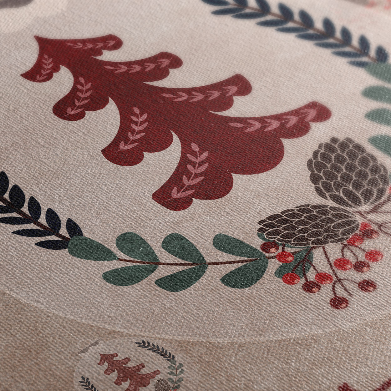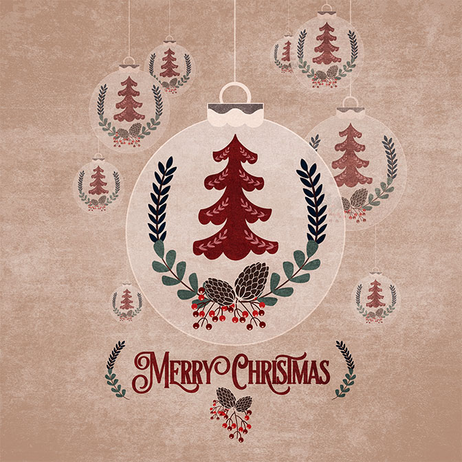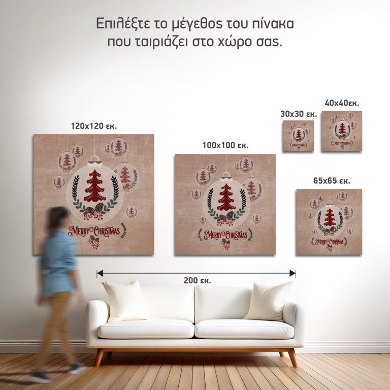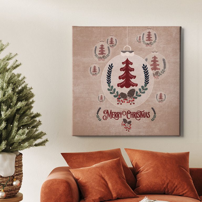 Ένας κομψός και ζεστός πίνακας Χριστουγέννων με καλλιτεχνική απεικόνιση γιορτινών μπαλών. Στο κέντρο ξεχωρίζει μια μεγάλη μπάλα που φιλοξενεί ένα κόκκινο χριστουγεννιάτικο δέντρο, πλαισιωμένο από φύλλα, κουκουνάρια και κόκκινους καρπούς. Οι απαλές μπεζ αποχρώσεις και η ρετρό υφή του φόντου δημιουργούν μια αίσθηση νοσταλγίας και θαλπωρής. Ένα διακριτικό αλλά εντυπωσιακό έργο που αποπνέει γιορτινή κομψότητα, ιδανικό για να στολίσει το σπίτι ή τον επαγγελματικό σας χώρο τα Χριστούγεννα.