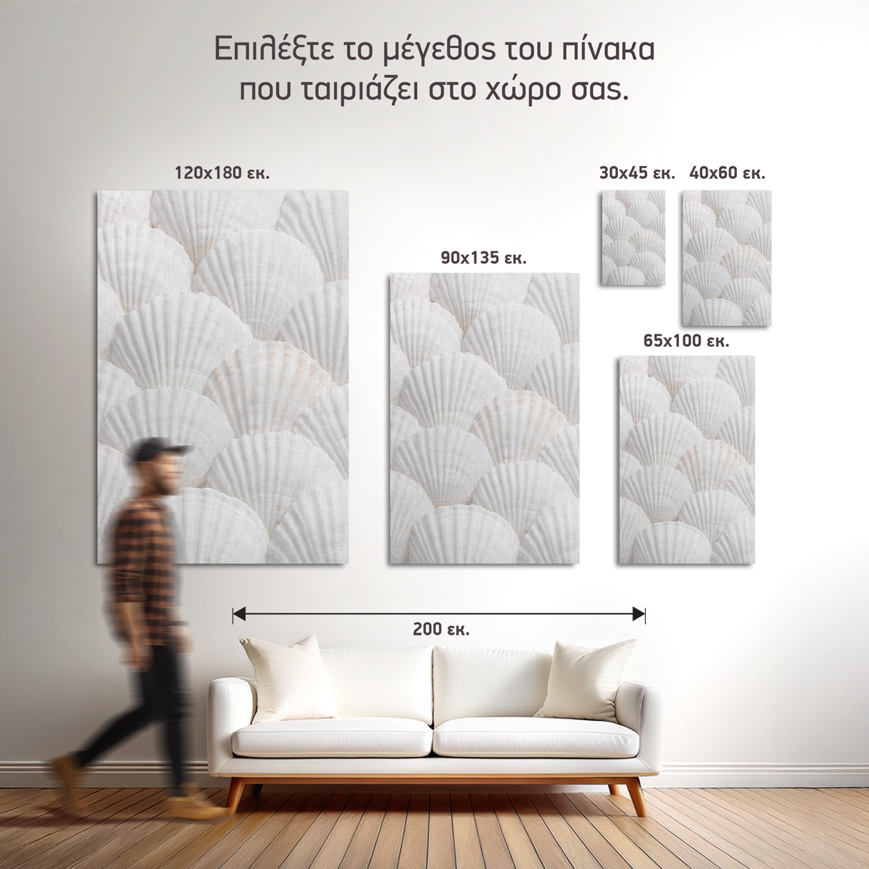 Πίνακας ζωγραφικής κομψός και γαλήνιος που παρουσιάζει κοχύλια τοποθετημένα απαλά το ένα δίπλα στο άλλο, σε αποχρώσεις εμπνευσμένες από το Cloud Dancer, το επίσημο χρώμα της χρονιάς 2026 από την Pantone. Οι απαλοί, αέρινοι τόνοι προσδίδουν μια καθαρή, φωτεινή αισθητική, ιδανική για χώρους που χρειάζονται μια δόση ηρεμίας και φυσικής κομψότητας.