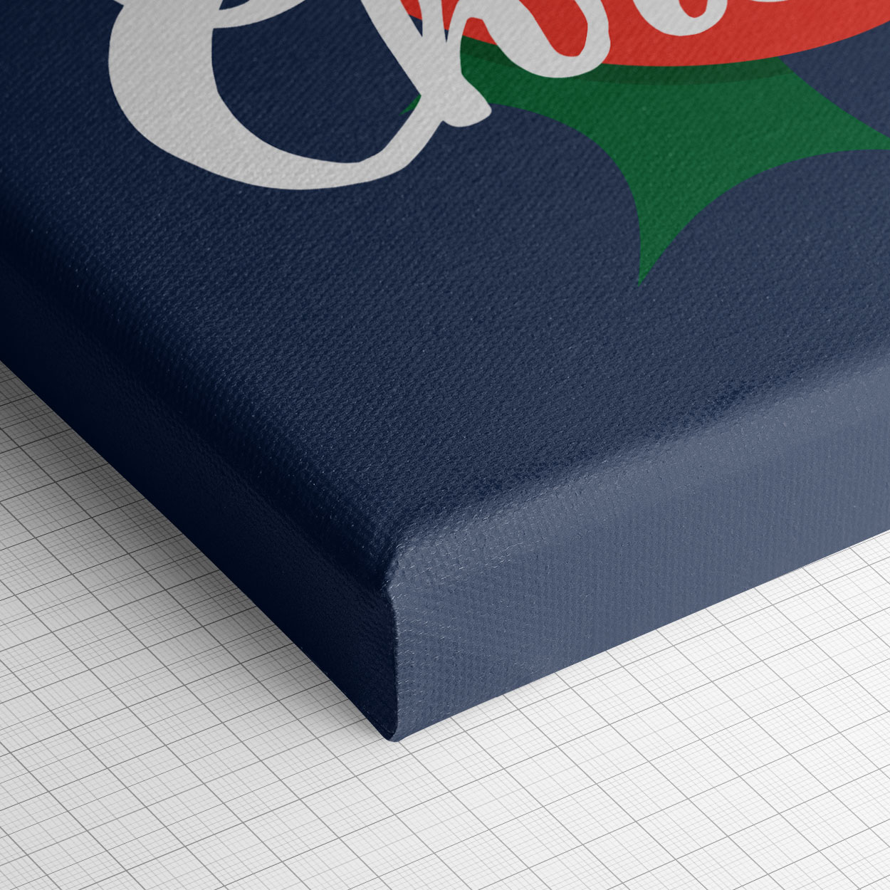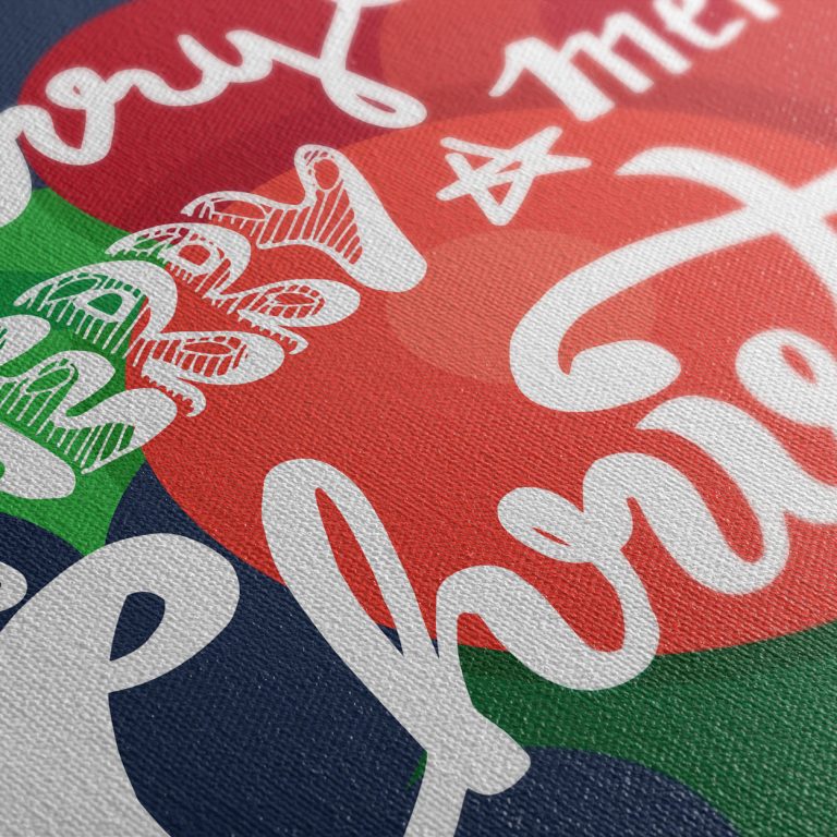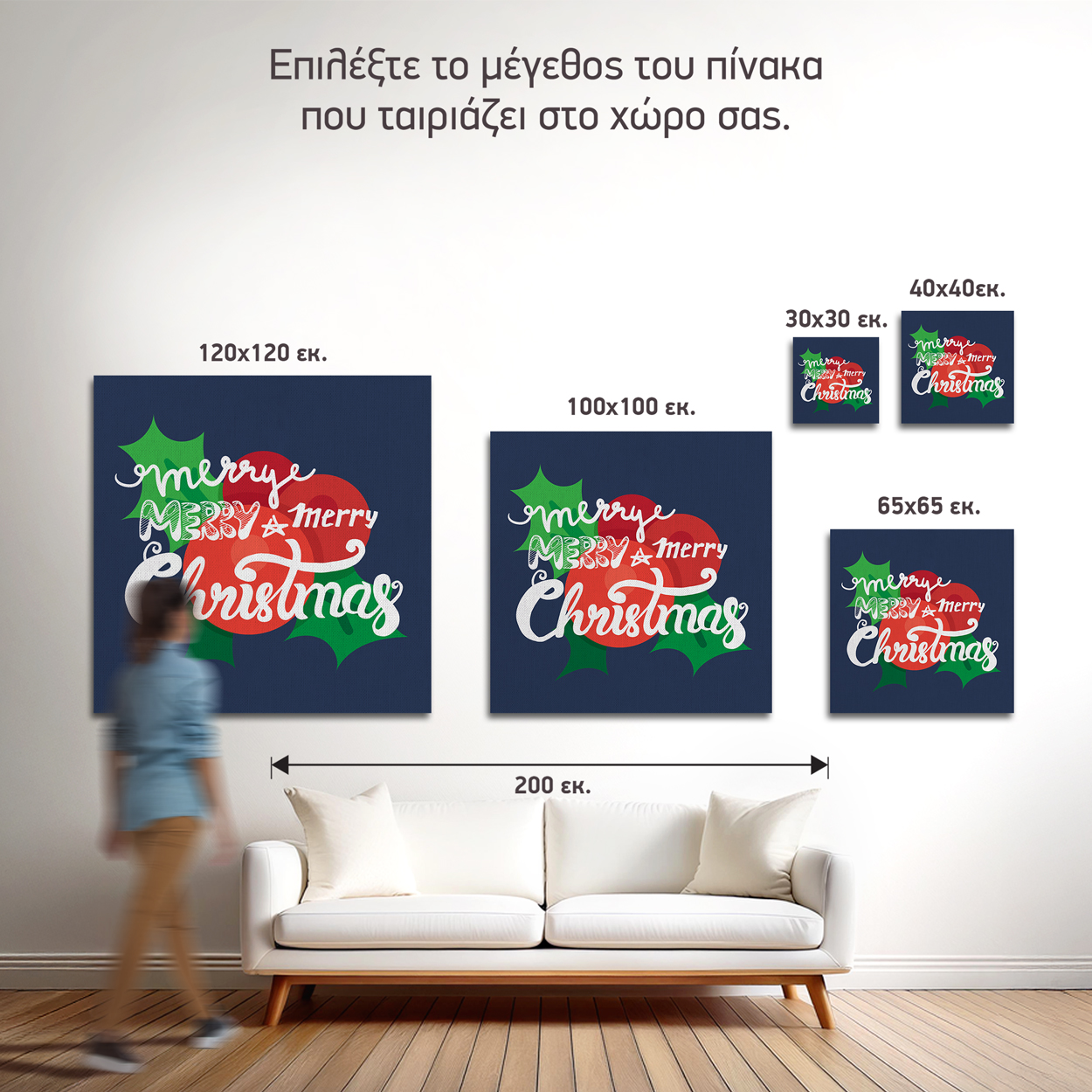 Ζωηρός πίνακας με λεκτικό «Merry Christmas» σε λευκό πάνω σε βαθύ μπλε φόντο και πράσινα φύλλα που δημιουργούν ζεστή, φιλική γιορτινή εντύπωση. Ιδανικός για βιτρίνες, σαλονιά ή δωράκια που θέλουν ένα μοντέρνο και χαρούμενο χριστουγεννιάτικο ύφος.