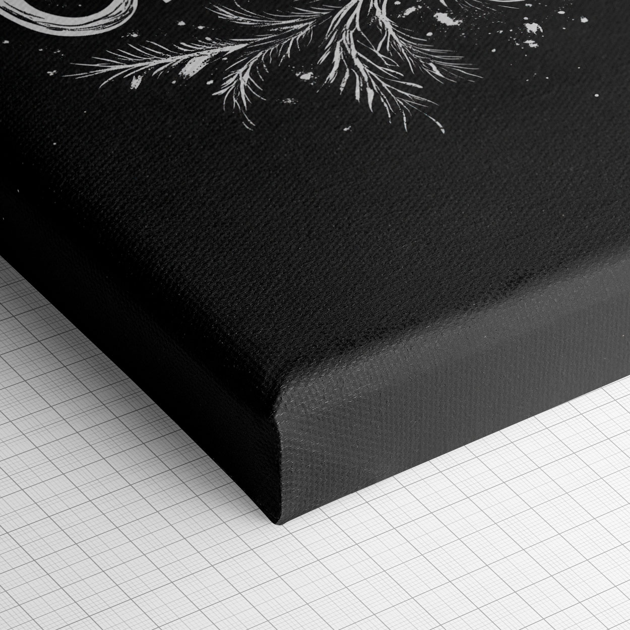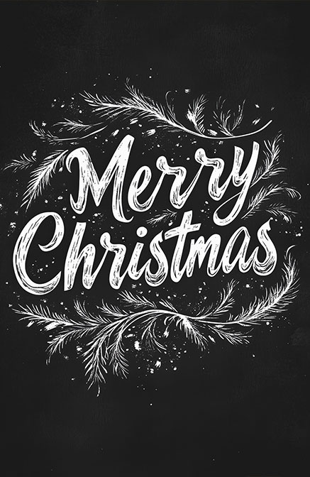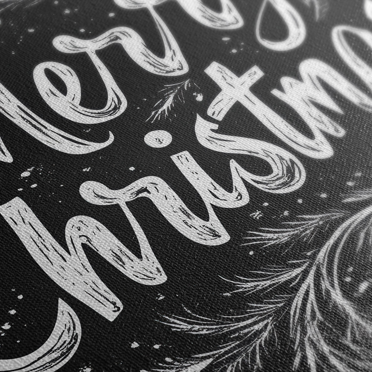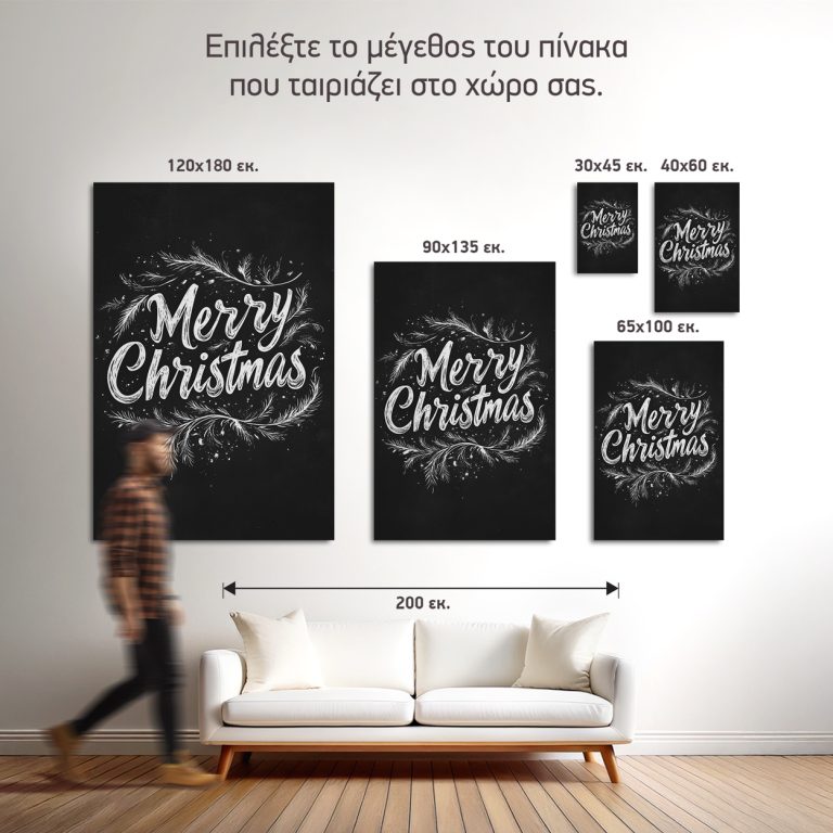 Πίνακας ζωγραφικής με το κλασικό ''Merry Christmas'', με χιόνια και κλαδιά τριγύρω σε μαύρο φόντο. Η κομψή αντίθεση λευκού-μαύρου προσδίδουν διαχρονική, εορταστική ατμόσφαιρα. Ιδανικό για βιτρίνες, ρεσεψιόν και γραφεία αλλά και για το σπίτι, σαλόνι ή είσοδο, που θέλουν κομψή, διακριτική χριστουγεννιάτικη πινελιά.
