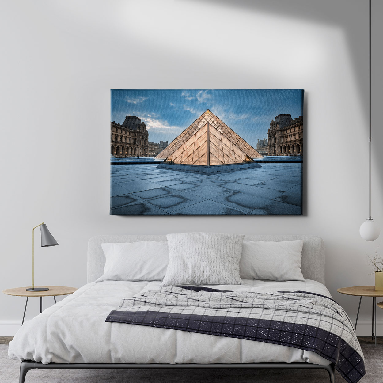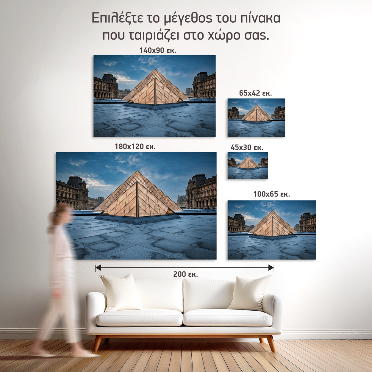 Οι πίνακες ζωγραφικής που απεικονίζουν την εξωτερική αρχιτεκτονική του Λούβρου με την γυάλινη πυραμίδα, θα ανανεώσουν το χώρο σας με αυτό το εμβληματικό σύμβολο του μουσείου.