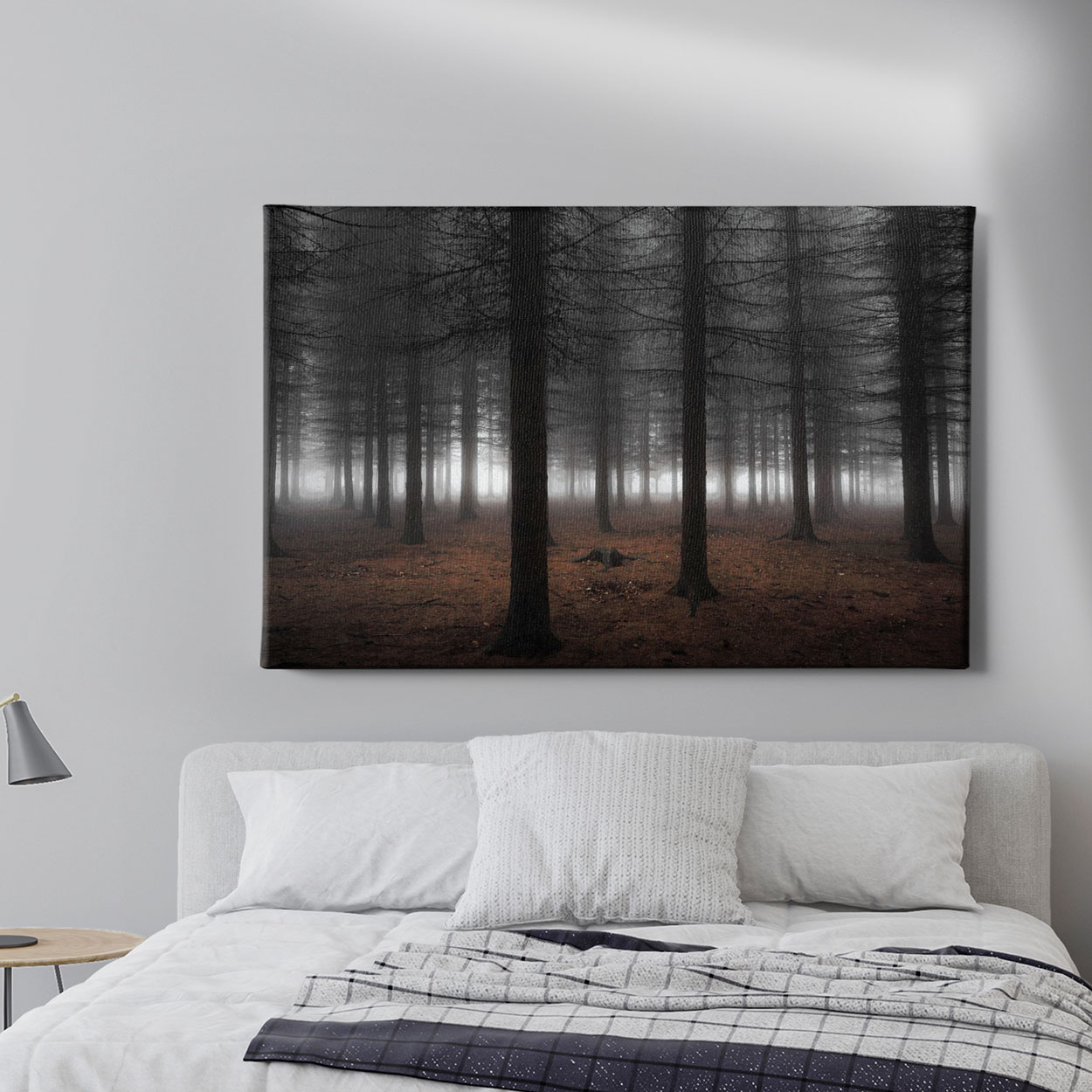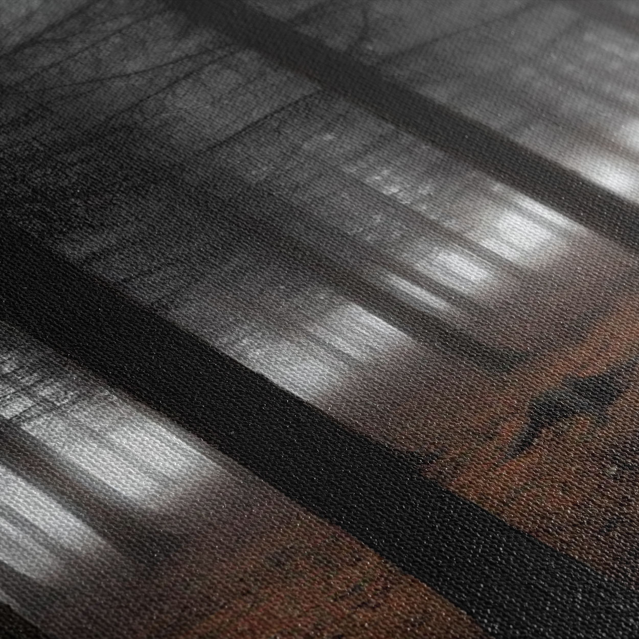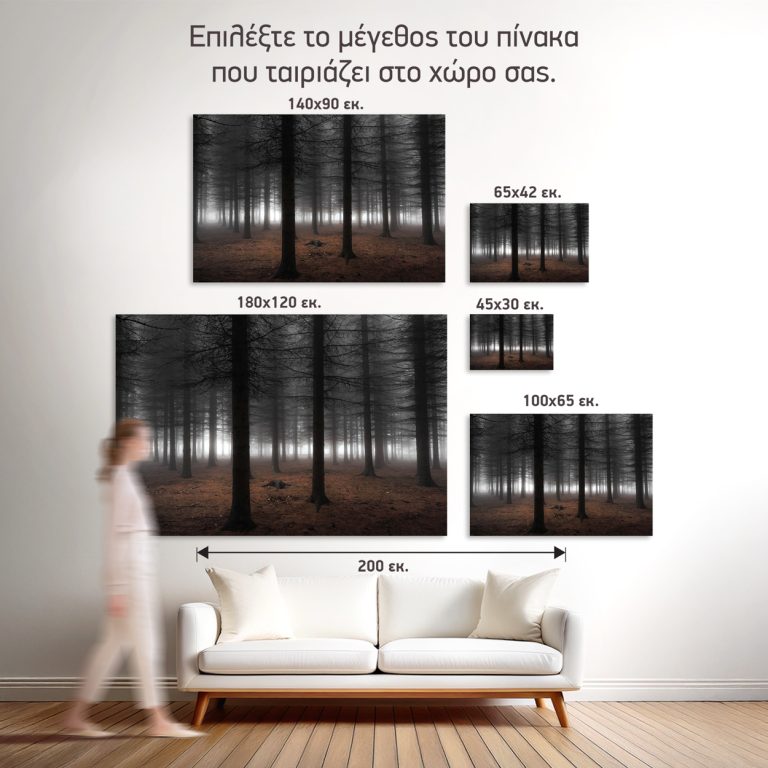 Ατμοσφαιρικός πίνακας που αποτυπώνει ένα μυστηριώδες δάσος τυλιγμένο στην ομίχλη. Οι ψηλοί κορμοί των δέντρων δημιουργούν μια σειρά από σιλουέτες που χάνονται στο θολό φως, ενώ η μυστηριώδης ατμόσφαιρα ενισχύεται από τη γήινη χρωματική παλέτα. Η ασπρόμαυρη επεξεργασία με τους καφέ τόνους προσθέτει μια vintage, κινηματογραφική αισθητική που θυμίζει σκηνές από gothic ταινίες. Η ομίχλη διαχέεται ανάμεσα στα δέντρα δημιουργώντας επίπεδα βάθους και μια αίσθηση απεραντοσύνης. Το φως που διαπερνά τη σκηνή δημιουργεί μια ονειρική, μεταφυσική διάθεση. Η σύνθεση αποπνέει μια αίσθηση μοναξιάς και στοχασμού, ενώ η φυσική ομορφιά του δάσους παραμένει μαγευτική παρά τη μυστηριώδη ατμόσφαιρα. Ιδανικός για χώρους που χρειάζονται dramatic διακόσμηση, φυσική ομορφιά και contemplative διάθεση.